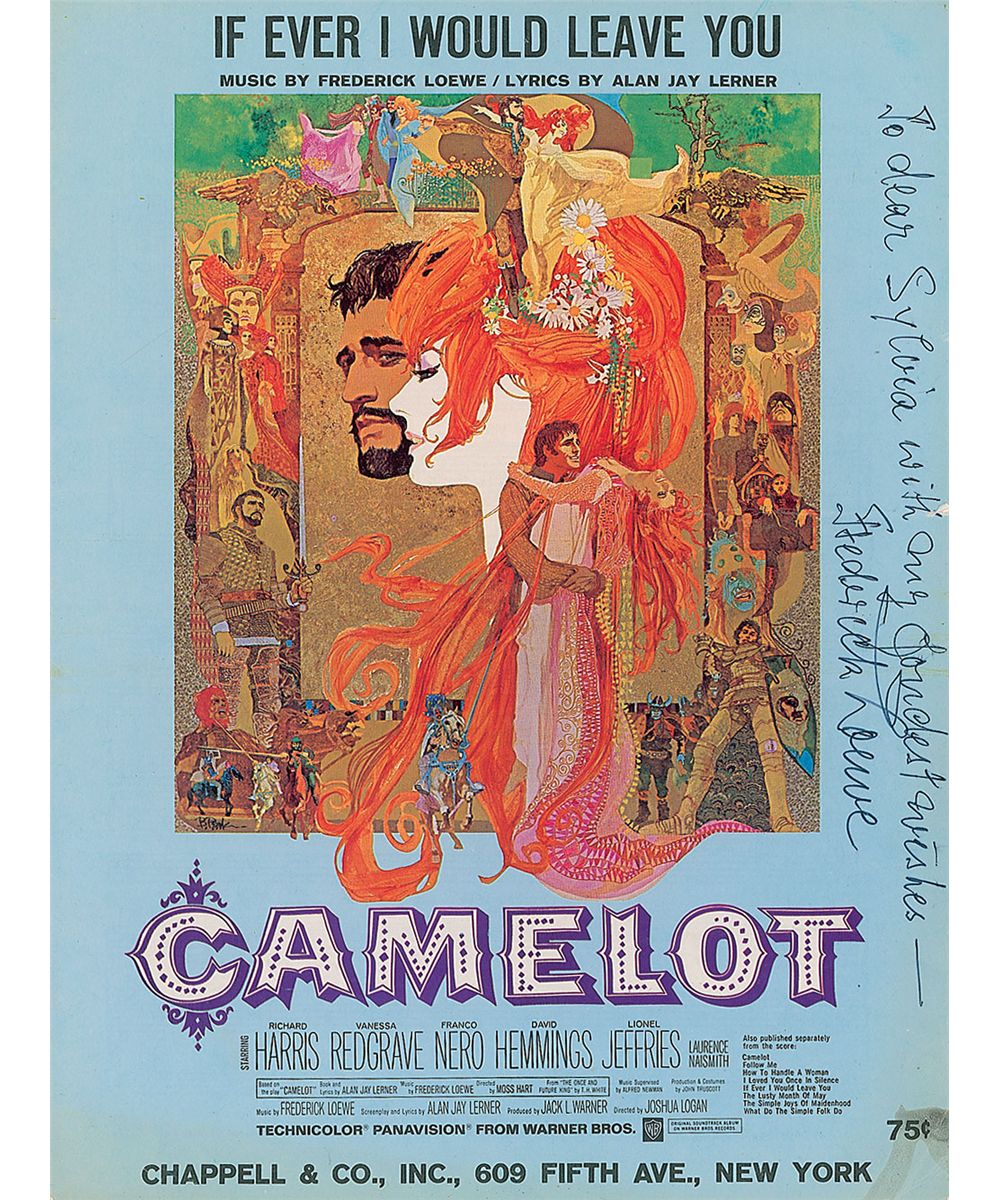 Vintage sheet music for ‘If Ever I Would Leave You’ from Camelot, 9 x 12, five pages, signed and inscribed vertically on the front cover in fountain pen, “To dear Sylvia with my fondest wishes—Frederick Loewe.” A horizontal fold, light scattered creases, and small a tear to right edge (slightly affecting the inscription), otherwise fine condition.
