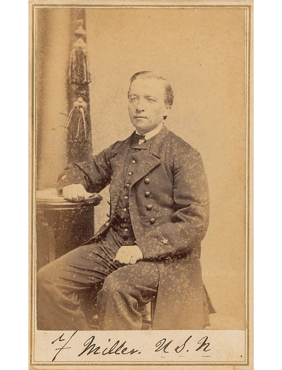Master’s Mate who served on board the USS Constitution in 1867. Original 2.25 x 4 carte-de-visite photo by C. H. Hopkins of Annapolis, signed in the lower border in black ink, “F. Miller, U.S.N.” In very good condition, with light overall spotting to image.