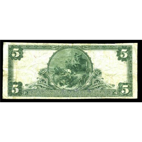 <B>Frederick, OK</B></I> - $5 1902 Plain Back Fr. 602 <B>The NB of Commerce</B></I> Ch. # (W)10095<BR>You can add this great note to the measly census of only 4 Large at present for this Tillman County bank. This is a bright <B>Fine+++</B></I> $5 with healthy edges and a couple of trivial pinholes. The dark purple stamped signatures are of early 1920s bank officers King and Howard. However, later officers R.B. Plott and W.W. Childers would place this bank in voluntary liquidation on April 26, 1930.