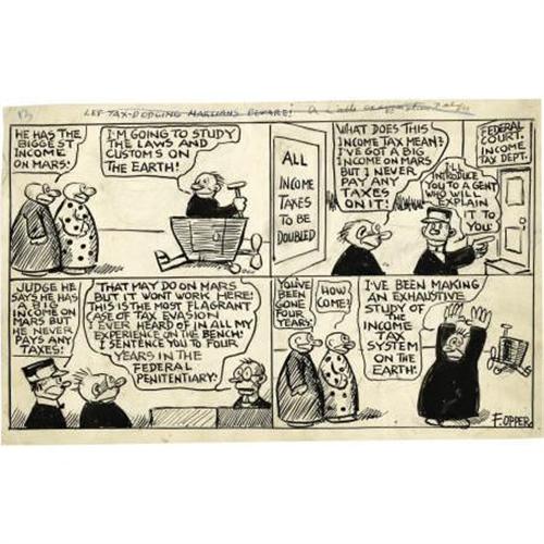 <B>Frederick Opper - Daily Comic Strip Original Art (undated).</B></I> In this strip titled, "A Little Exaggeration? Perhaps," it seems even Martians can run afoul of the IRS if they're not careful -- and regulations have only gotten worse since this cartoon was drawn. Frederick Opper is considered to be the one of the first American cartoonists to develop the use of speech balloons in a continuing comic strip. He was also among the first to use panels to advance the story line. This outrageous daily has an image area that measures approximately 12" x 7", and the art is in Very Good condition.<BR><BR><b>Shipping:</b> Flat Material, Small (<a target="_blank" href="http://www.heritageauctions.com/common/shipping.php">view shipping information</a>)