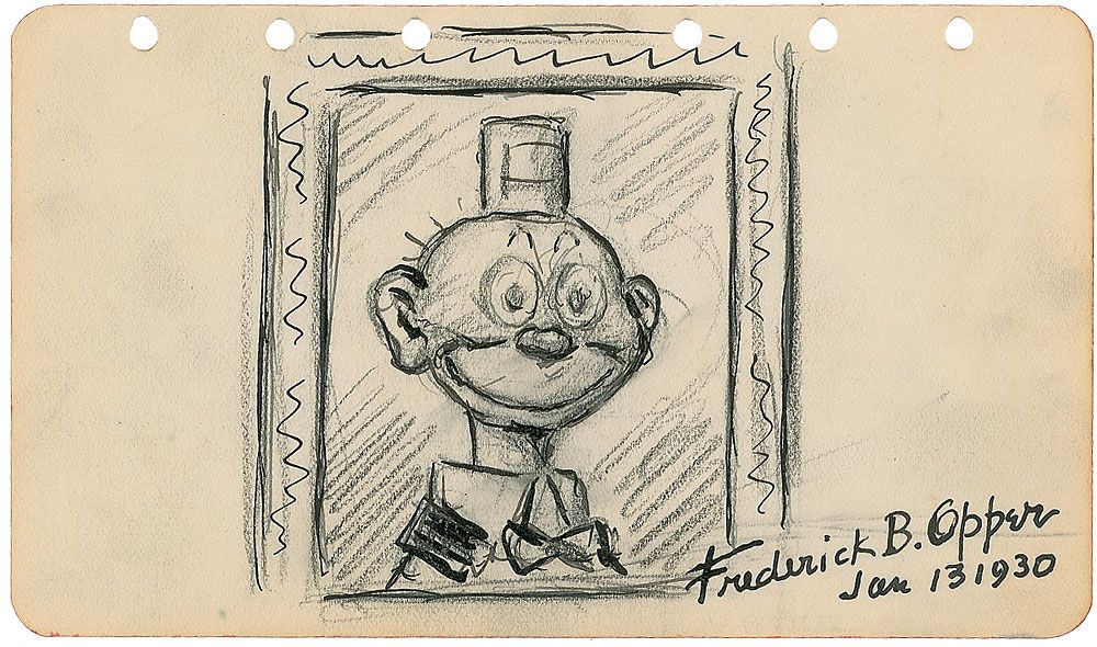 Original vintage signed ink and pencil sketch of Happy Hooligan on an off-white 6 x 3.5 album page, signed in black ink, “Frederick B. Opper, Jan. 13, 1930.” In fine condition.