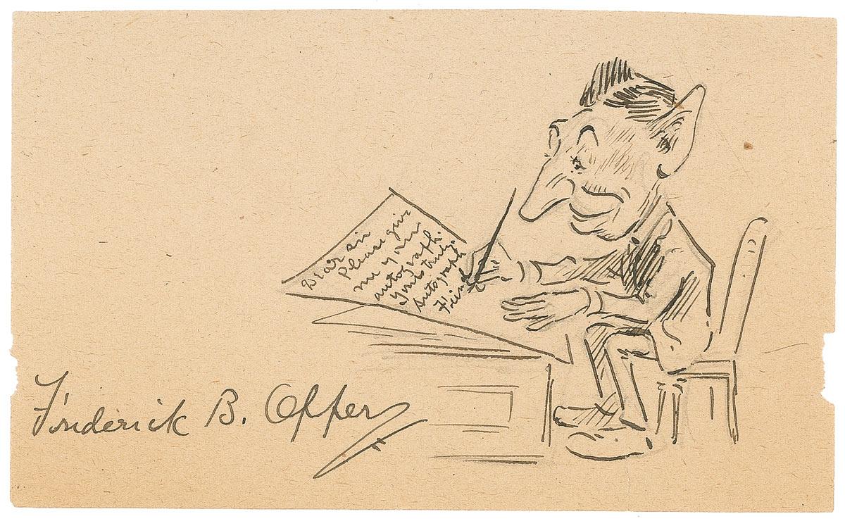 One of the pioneers of American newspaper comic strips (1857-1937), best known for his comic strip Happy Hooligan. Original vintage signed ink self-portrait with Opper writing a letter for an autograph, on an off-white 5.75 x 3.5 album page. In fine condition, with light overall toning, a couple of edge chips, and a small tear to bottom edge. RRAuction COA.