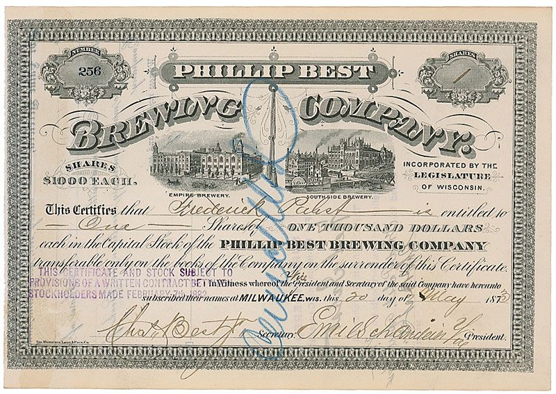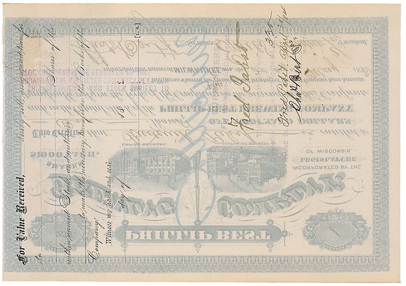 Brewer (1836–1904) who founded the company which, in the 1890s, introduced the ‘Blue Ribbon’ brand, the ‘beer that made Milwaukee famous.’ Partly-printed DS, signed “Fred Pabst,” one page, 10 x 7, May 20, 1873. Stock certificate for one share of Philip Best Brewing Company stock issued to Frederick Pabst. Signed on the front by Emil Schandein as president of the company and Charles Best, Jr., as secretary, and signed on the reverse by Pabst to confirm the certificate’s cancellation. In fine condition, with various cancellation stamps and notations.