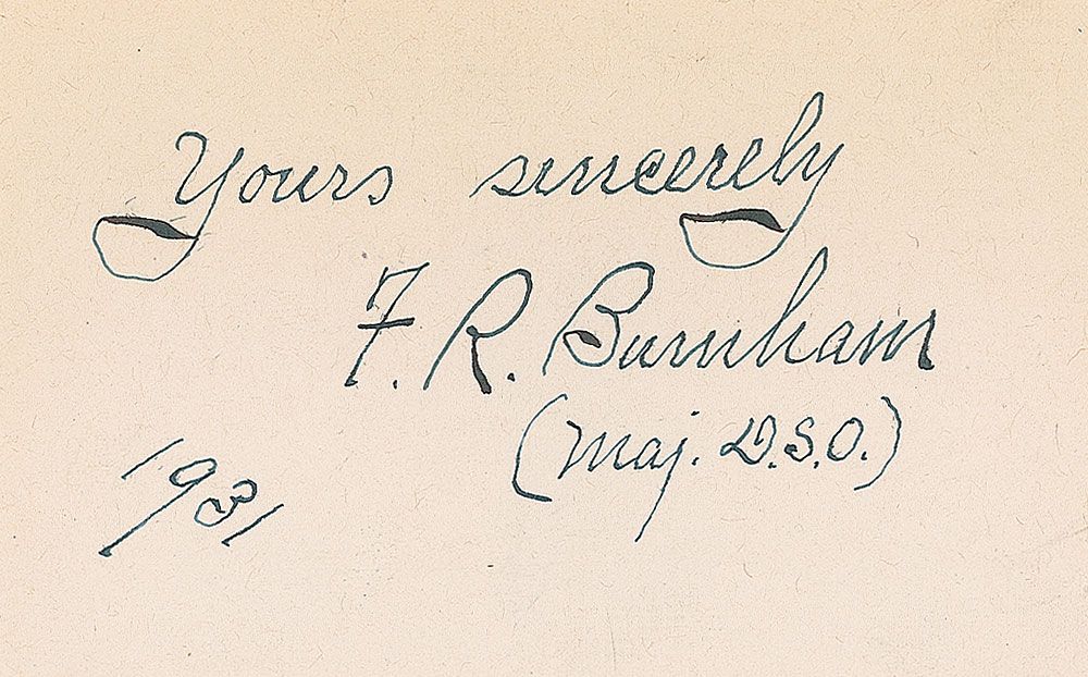 Scout and world traveling adventurer (1861–1947) known for his service to the British South Africa Company, the British Army in colonial Africa, and for teaching woodcraft to Robert Baden-Powell. Vintage ink signature, “Yours sincerely, F. R. Burnham, (Maj. D. S. O.), 1931,” on an off-white 3.5 x 2.25 card. Removably affixed to an off-white 8 x 10.5 scrapbook page also bearing a biography and image of Burnham. In fine condition.