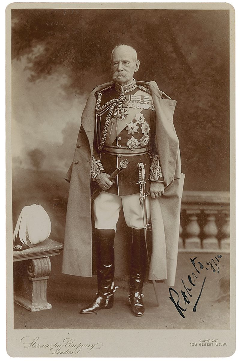 Highly decorated British field marshal (1832–1914) best known for leading the British victory during the Second Boer War. Original regal glossy 4.25 x 6.5 full-length cabinet photo of Roberts in full military uniform by the Stereoscopic Company of London, signed on the image in black ink, “Roberts FM.” In fine condition, with a couple spots of trivial rubbing to background of image and a bit of irregular ink adhesion to signature.