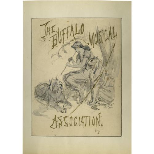 <B>Frederick S. Church Original Drawing Signed</B></I> "<I>F. S. Church</B></I>". Titled <I>The Buffalo Musical Association,</B></I> this drawing shows a young girl seated playing a flute while two lions look on peacefully. Ink wash with gold lettering, 7" x 9" sheet mounted to larger page, apparently done for the cover of a musical program. Church, (1842-1924), was known for his decorative work that includes a sense of fun and humor, especially of anthropomorphic animals. He was a native of Michigan who had a long career in New York City, often working as an illustration artist for magazines. He had in-depth knowledge of animal anatomy, which is evident in the depictions shown here. Fine condition.
