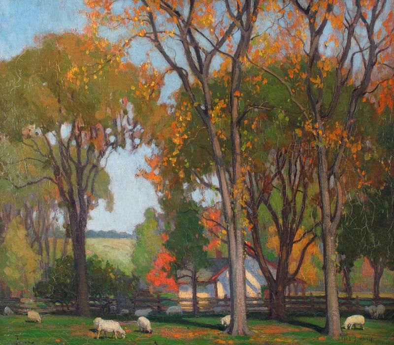 COUNTRY SCENE WITH GRAZING SHEEP