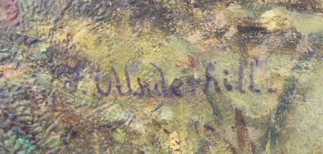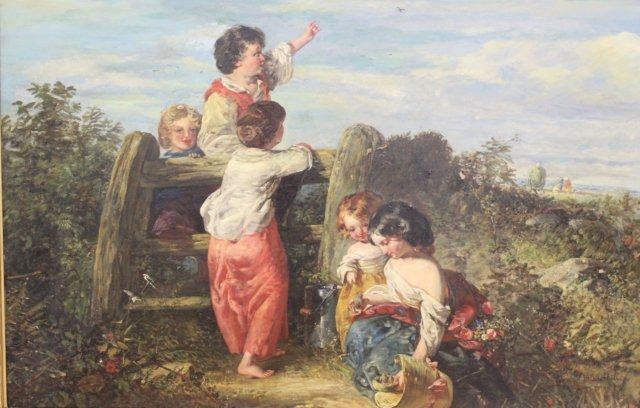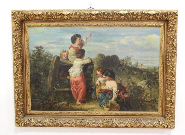 Children playing in rural landscape. Oil on canvas. Gilt framed. Signed lower right, F. T. Underhill. Frederick T. Underhill, British (1847-1897). Approx. 35" H x 53" W canvas, 45" H x 63" W framed. Paint loss. Relined. Flecking. Restored
