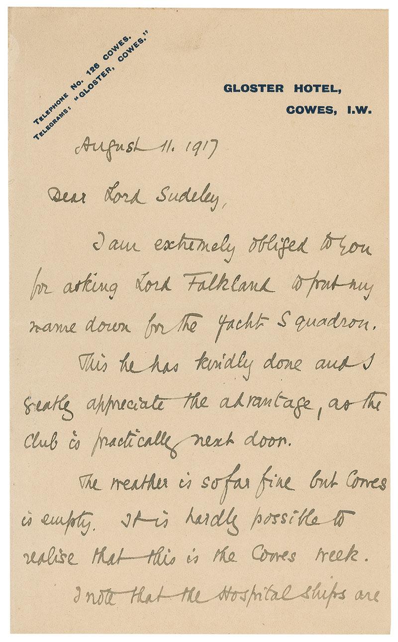 British surgeon (1853–1923) who saved Edward VII’s life with an emergency appendectomy shortly before the coronation and who served as the personal physician to ‘Elephant Man’ John Merrick. ALS, two pages, 4.25 x 7, Gloster Hotel letterhead, August 11, 1917. Letter to Lord Sudley. In part: “I am extremely obliged to you for asking Lord Falkland to put my name down for the Yacht Squadron. This he has kindly done and I greatly appreciate the advantage, as the club is practically next door…I note that the hospital ships are now painted grey and armed.” In fine condition, with rough left edges to both pages and a uniform shade of mild toning.