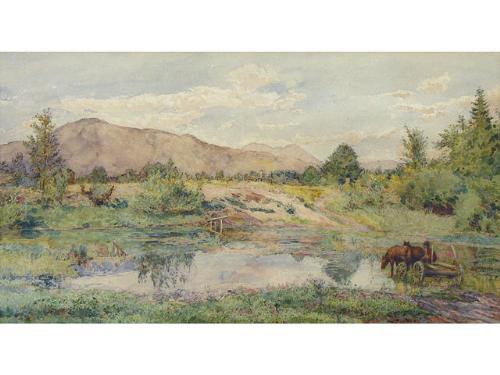 [Canadian, 1863-1941] UNTITLED; CROSSING A RIVER; 1931 Watercolour on paper 8 1/2 x 15 1/2 ins. -Signed & dated