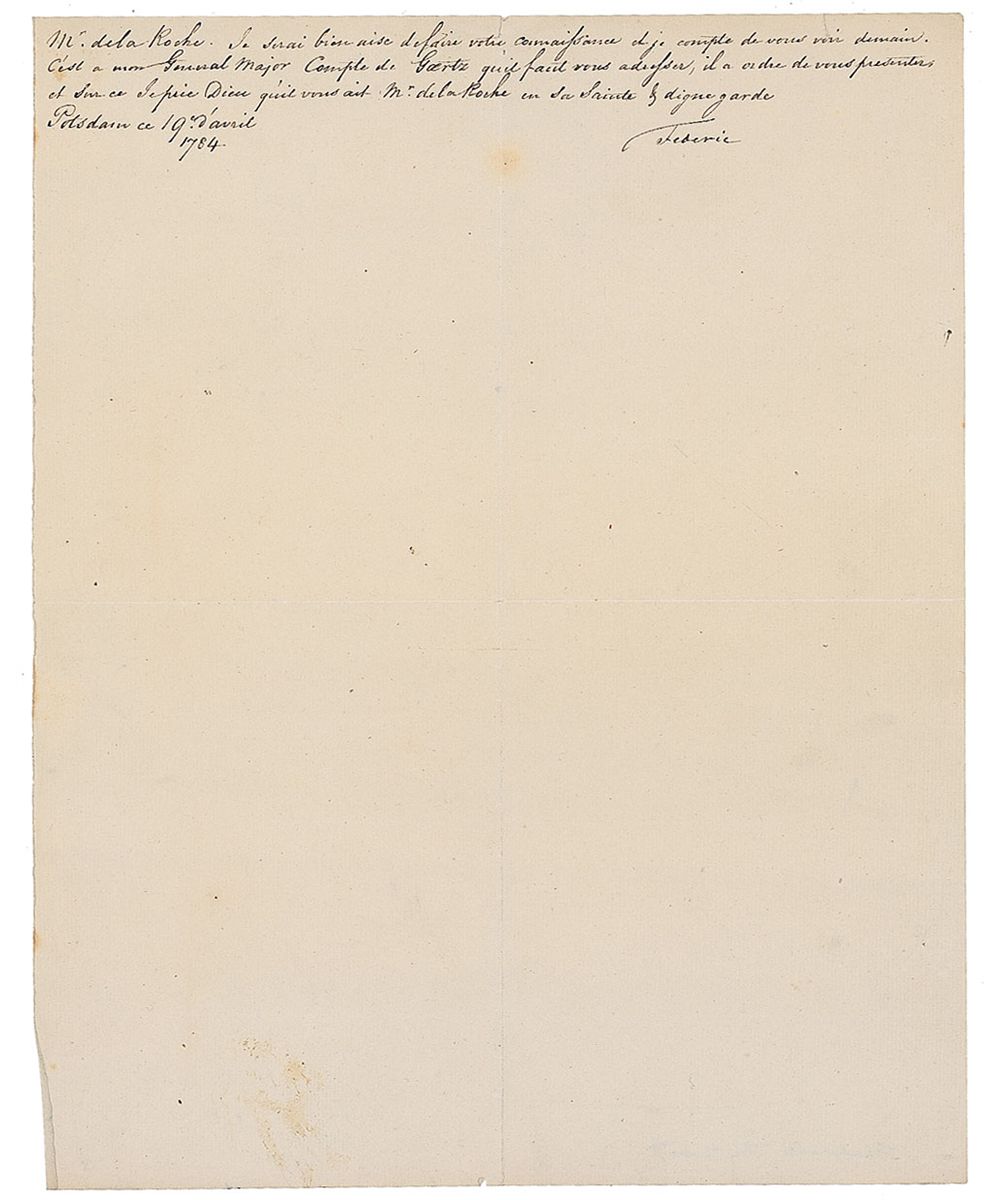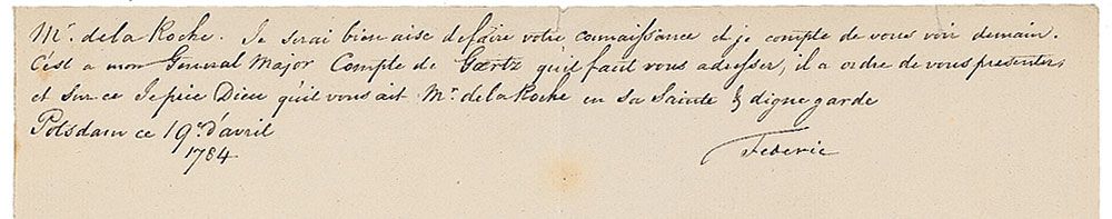 King of Prussia (1712–1786) from 1740 until his death. His political prowess and enlightened attitudes toward religion, learning, and the humanities earned him the sobriquet ‘Frederick the Great.’ LS in French, signed “Federic,” one page, 7.75 x 9.75, April 19, 1784. Untranslated letter in French regarding “General Major Compte de Gaertz.” Central vertical and horizontal folds and light scattered soiling, otherwise fine condition.