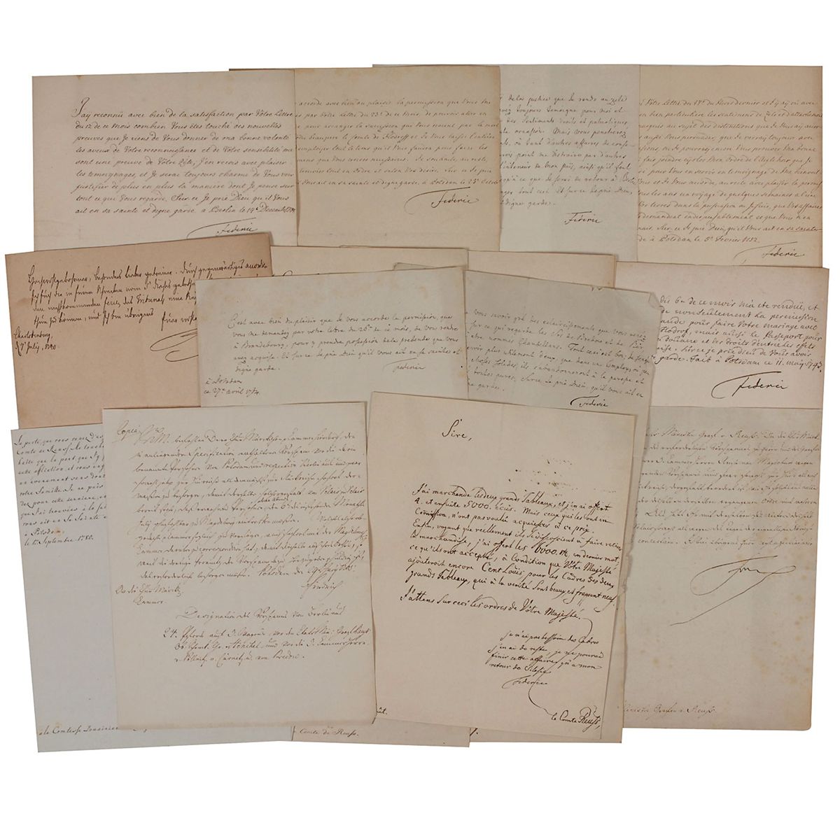 King of Prussia (born 1712) from 1740 until his death in 1786. His political prowess and enlightened attitudes toward religion, learning, and the humanities earned him the sobriquet ‘Frederick the Great.’ Collection of 15 untranslated LSs, three in German and 12 in French, all signed “Frederic,” or “Federic,” all one page, 7.5 x 9, spanning more than 40 years from 1740 to 1780, and all to his longtime minister and personal advisor Henry IX, Count Reuss de Kostritz (1711–1780). In overall very good to fine condition.