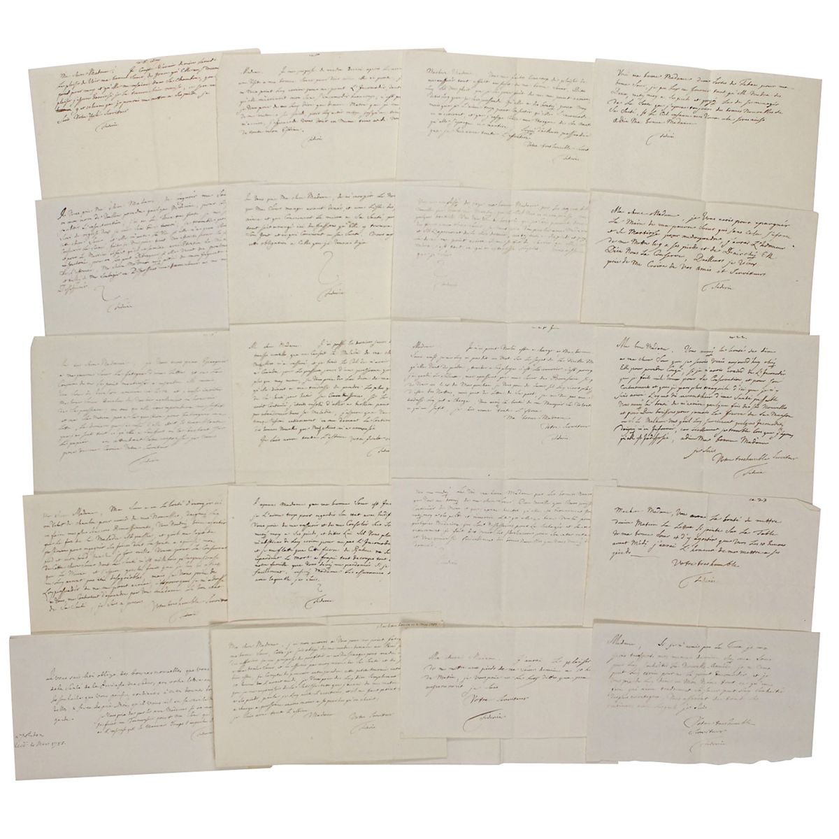 King of Prussia (born 1712) from 1740 until his death in 1786. His political prowess and enlightened attitudes toward religion, learning, and the humanities earned him the sobriquet ‘Frederick the Great.’ Collection of 20 untranslated letters, 19 ALSs and one LS, all in French, all signed “Federic,” all dated circa 1777–1785, each one page, various sizes, and all to Eleonore de Maupertuis, Lady of the Household to Princess Anna Amalia of Prussia, Frederick’s younger sister. Letters reflect Frederick’s concern for Amalia’s health after she suffered a stroke in 1773 and underscore the close relationship between the siblings. In overall fine condition, with central horizontal and vertical folds to most of the letters. Accompanied by a brown sheet with a late 18th century caption which reads, “Collection de Lettres de Frederic le Grand Roi de Prusse, de Sa main propre; a feue Madame de Maupartuis Gouvernante de feue la Princess Amelie Soeur de ce Roi.”