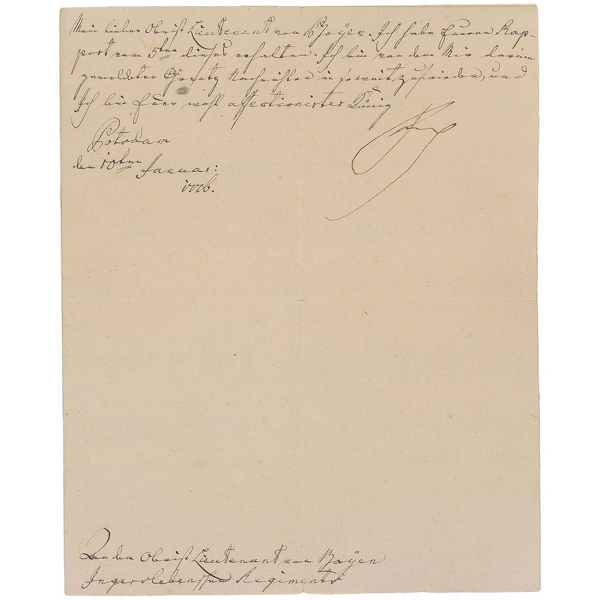 LS in German, one page, 7.25 x 9, January 10, 1776. Letter to Lieutenant Colonel von Boyen’s Regiment in Ingersleben, confirming receipt of a report from the 5th and expressing his satisfaction with the news. In fine condition, with central vertical and horizontal folds (small separation at intersection). Accompanied by the original transmittal envelope. An attractive letter, written just one day after Germany agreed to loan out their soldiers to Great Britain to help put down the rebellion in the Americas.