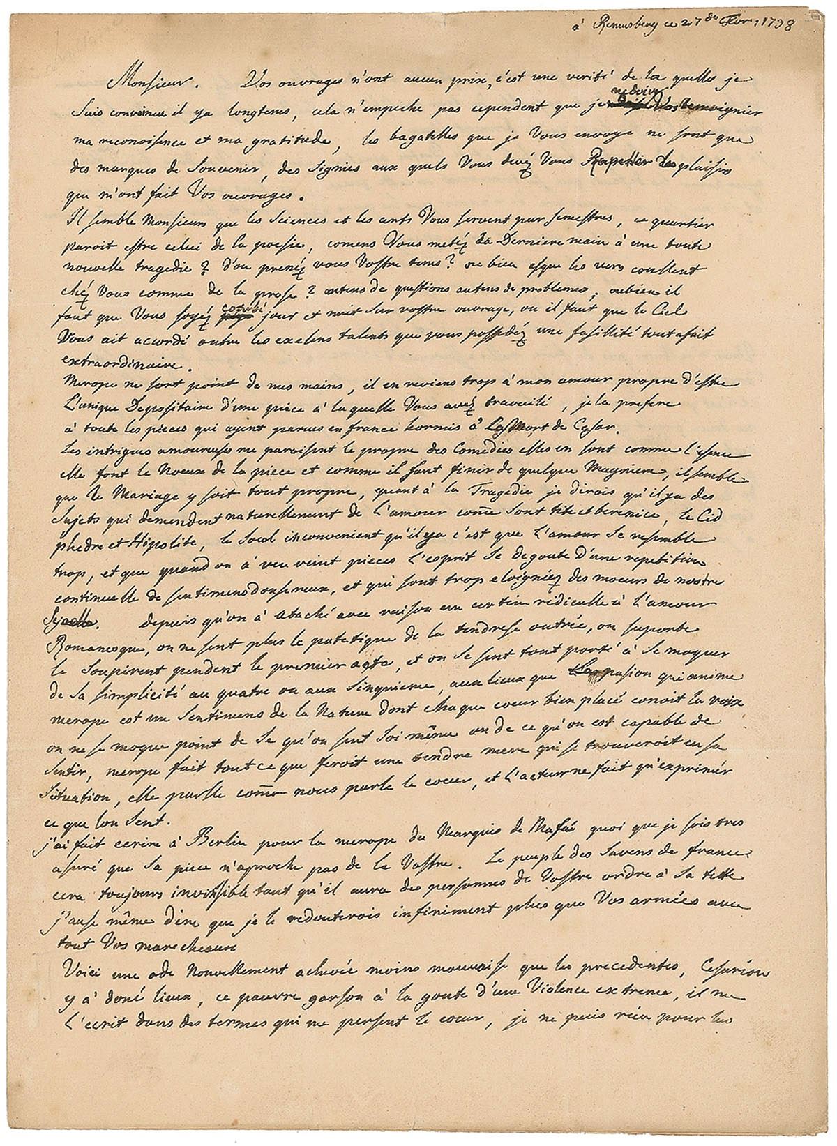 Engrossed with the French Enlightenment in the mid-1730s, Crown Prince Frederick began a now-famous correspondence with Voltaire that would last nearly half a century. For the first four years, leading up to Frederick's crowning, the two indulged their mutual intellectual fascinations with one another, prodigiously writing and enclosing their latest poems, philosophies, and reviews, amidst glowing praise. This letter, written two years into their friendship, captures the intensity of their early relationship. Complimenting Voltaire's prolific work and range—"This quarter seems to belong to poetry. How is it that you are putting the finishing touches to an entirely new tragedy?...Or might it be that verses flow from you like prose?"—Frederick offers his scholarly opinion on the place of romance in different genres of drama, using Voltaire's recent reinterpretation of the Francesco Maffei drama 'Merope' as the example of the perfect use. Sharing a new ode of his own, he encourages Voltaire to send his opinion of the work, remarking that though he is proud of it, "my eyes aren't sufficiently open concerning my own work." His closing comments referring to Emilie du Chatelet's 1737 paper 'Dissertation on the Nature and Propagation of Fire,' are especially interesting, offering glowing praise of her genius—quite opposite the harsh opinions he expressed in private, fueled by his jealousy of the attention that Voltaire bestowed upon her. While the two lived together at Cirey, her chateau in Lorraine, Frederick sent 'Cesarion' there to obtain copies of all Voltaire's works. A fascinating letter revealing the spark of this famous friendship between two of 18th-century Europe's most influential men.