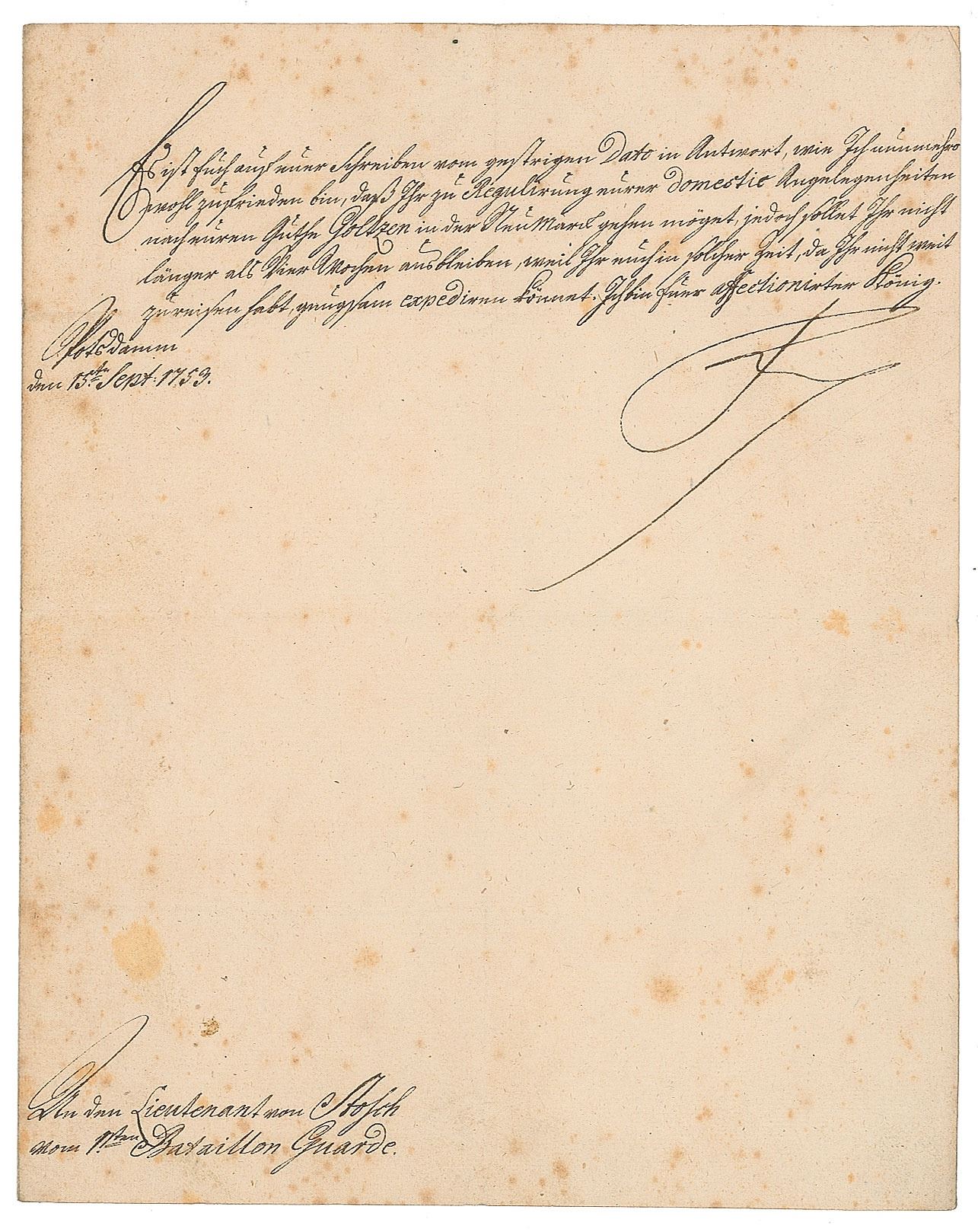 King of Prussia (born 1712) from 1740 until his death in 1786. His political prowess and enlightened attitudes toward religion, learning, and the humanities earned him the sobriquet 'Frederick the Great.' LS in German, one page, 7.5 x 9.5, September 15, 1753. Frederick allows an officer to go to Neumark to handle his 'domestic affairs,' asking that he return within four weeks. In fine condition, with scattered light foxing.