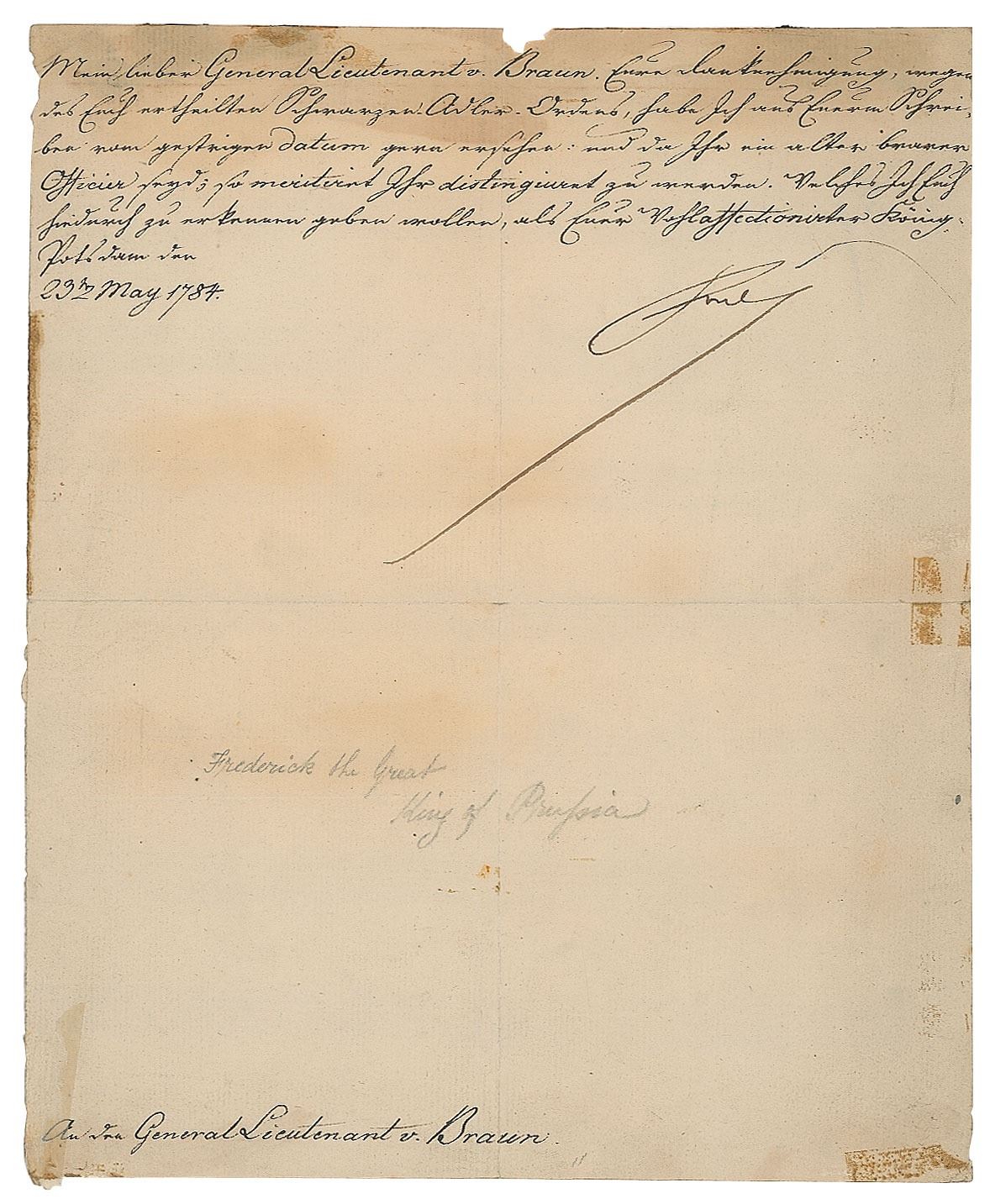 King of Prussia (born 1712) from 1740 until his death in 1786. His political prowess and enlightened attitudes toward religion, learning, and the humanities earned him the sobriquet 'Frederick the Great.' LS in German, one page, 7.25 x 9, May 23, 1787. Untranslated letter to "General Lieutenant v. Braun." In very good to fine condition, with light soiling, old tape stains at the edges, and light show-through along the top edge from old adhesive residue on the reverse. Accompanied by a photocopy of collector Ray Denslow's 1955 correspondence with noted dealer Charles Hamilton, purchasing the letter. That this letter is to a military official makes it particularly intriguing, as Frederick the Great was famed for his military victories and for the reorganization of Prussian armies.