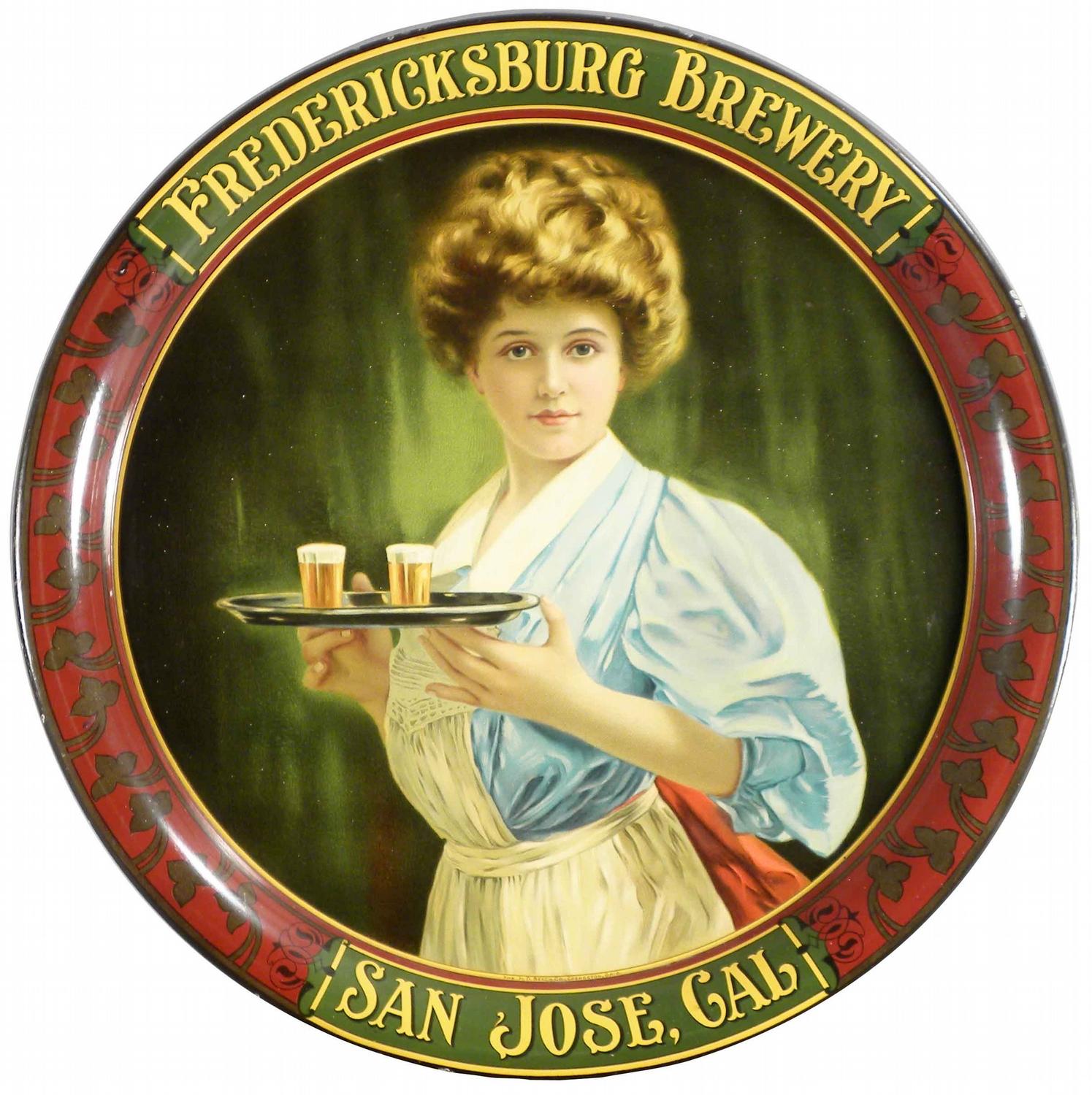 Fredericksburg Brewing Tin Serving Tray, San Jose, Calif. The H.D. Beach Co. Coshocton, OH. Some small scratches around the outside edge otherwise near mint condition. 13 inch diameter.