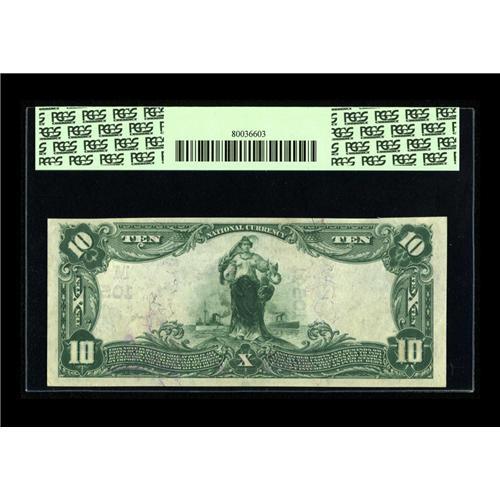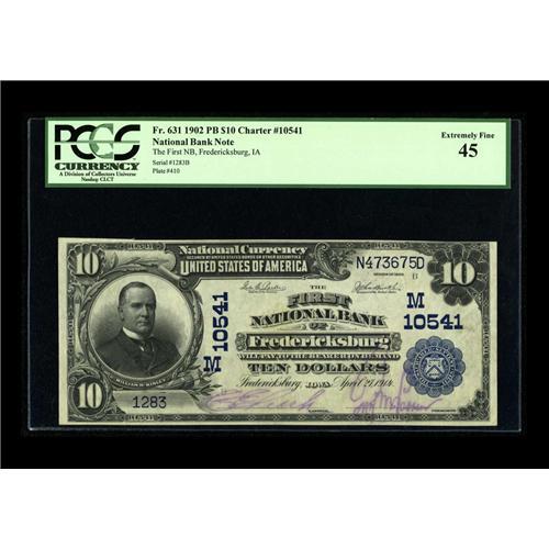 <B>Fredericksburg, IA</B></I> - $10 1902 Plain Back Fr. 631 <B>The First NB</B></I> Ch. # (M)10541<BR>This <B>PCGS Extremely Fine 45</B></I> is one of only two of its type and denomination documented in the census from here. It appears to have been graded by the certification authority with a conservative eye and enjoys all the visual appeal of any fully uncirculated note. We suspect that its realization will be based more on its level of aesthetic allure rather than the assigned technical grade.<BR><BR><b>Shipping:</b> Coin/Currency (<a target="_blank" href="http://www.heritageauctions.com/common/shipping.php">view shipping information</a>)