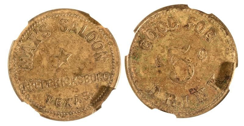 Max's Saloon / (star) / Fredericksburg / Texas; reverse: Good For / 5c / Drink.