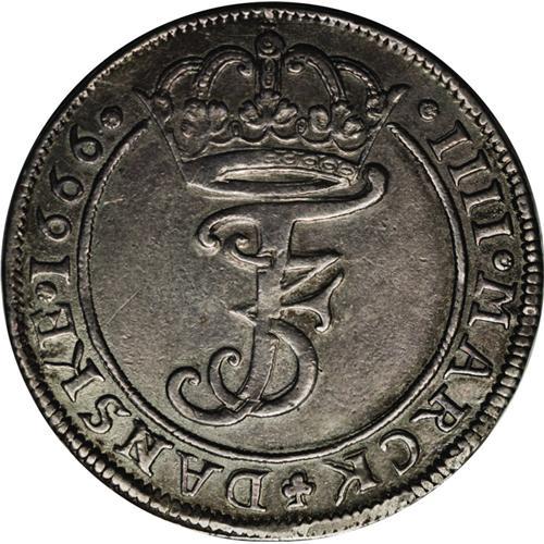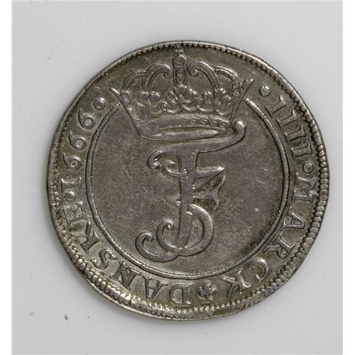 <B>Frederik III Krone/4 Mark 1666, </B></I>KM276, Davenport 3582, nicely toned XF, small flan flaw or trace of mounting above the crown on the reverse. First type with the denomination, IIII Marck, on the obverse.<BR><BR><b>Shipping:</b> Coin/Currency (<a target="_blank" href="http://www.heritageauctions.com/common/shipping.php">view shipping information</a>)