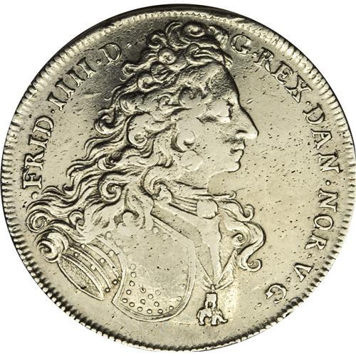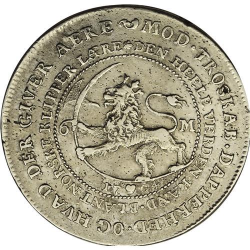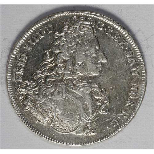 <B>Frederik IIII 6 Mark 1704, </B></I>KM479, Davenport 1289, obverse legend with FRID IIII, VF, cleaned long ago and still quite bright.<BR><I>From the Blue Ridge Collection</B></I><BR><BR><b>Shipping:</b> Coin/Currency (<a target="_blank" href="http://www.heritageauctions.com/common/shipping.php">view shipping information</a>)