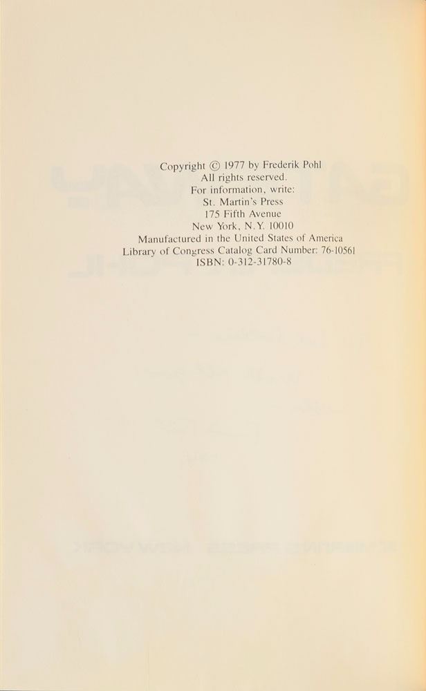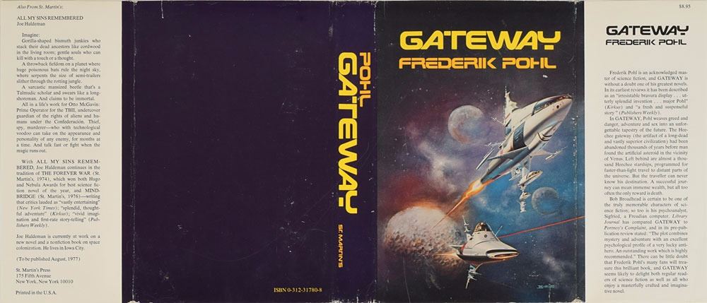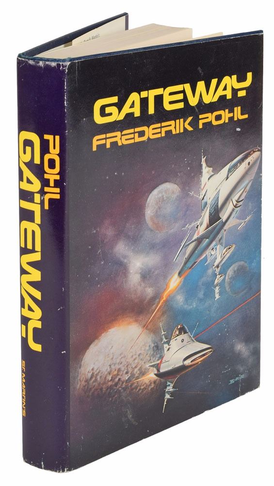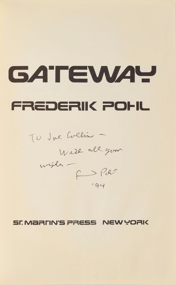 Signed book: Gateway. First edition. NY: St. Martin's Press, 1977. Hardcover with dust jacket, 5.75 x 8.5, 313 pages. Signed and inscribed on the title page in black ballpoint, "To Joe Collins—With all good wishes—Frederik Pohl, '94." Autographic condition: fine. Book condition: VG/VG, with small areas of discoloration to boards and a couple tiny edge tears to dust jacket. The opening novel in Pohl's Heechee saga, Gateway was released to wide critical acclaim—it won the 1978 Hugo Award for Best Novel, the 1978 Locus Award for Best Novel, the 1977 Nebula Award for Best Novel, and the 1978 John W. Campbell Memorial Award for Best Science Fiction Novel.