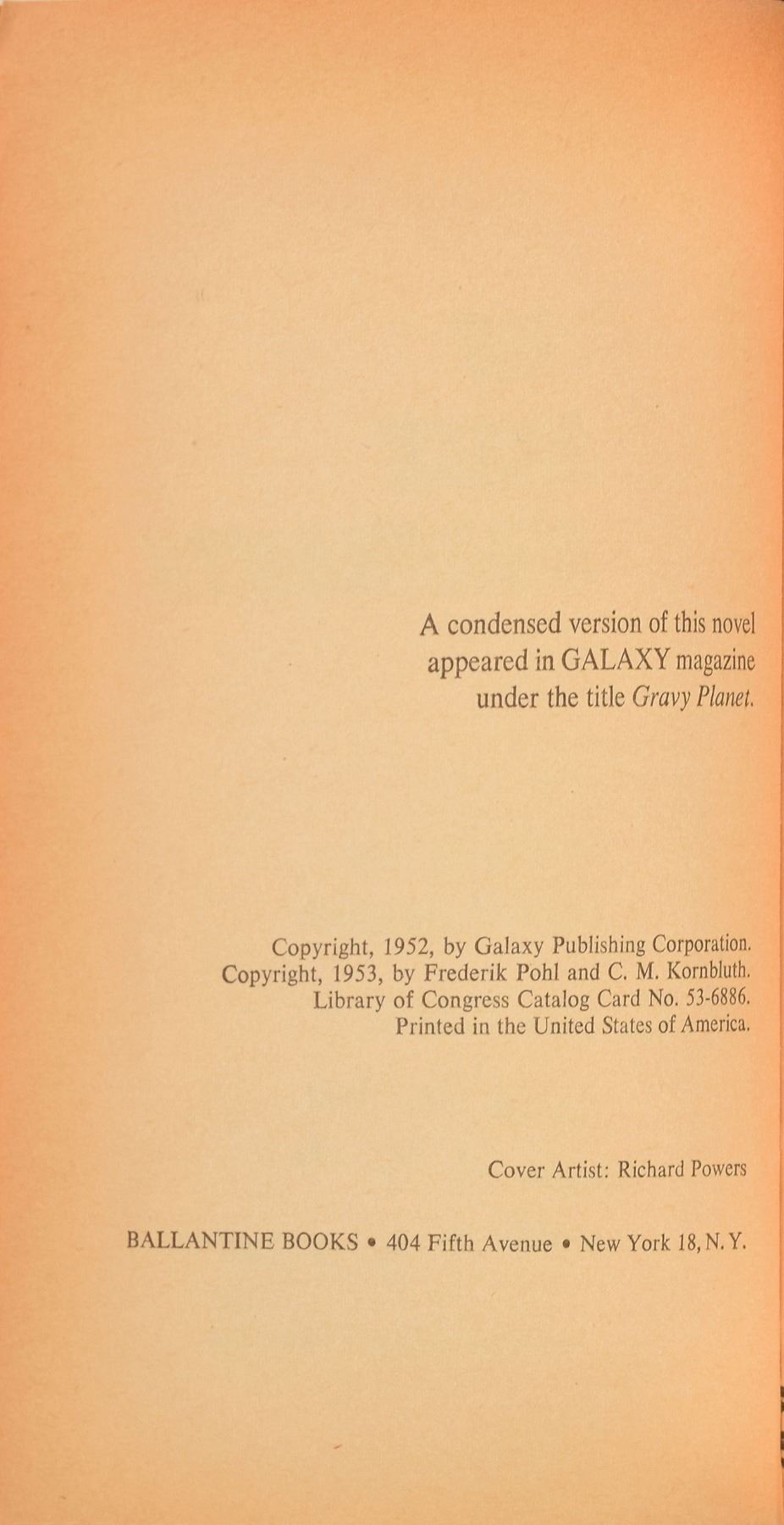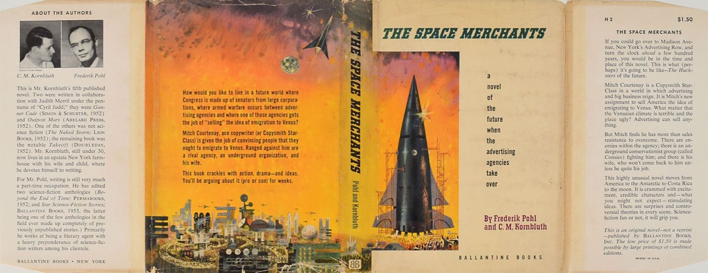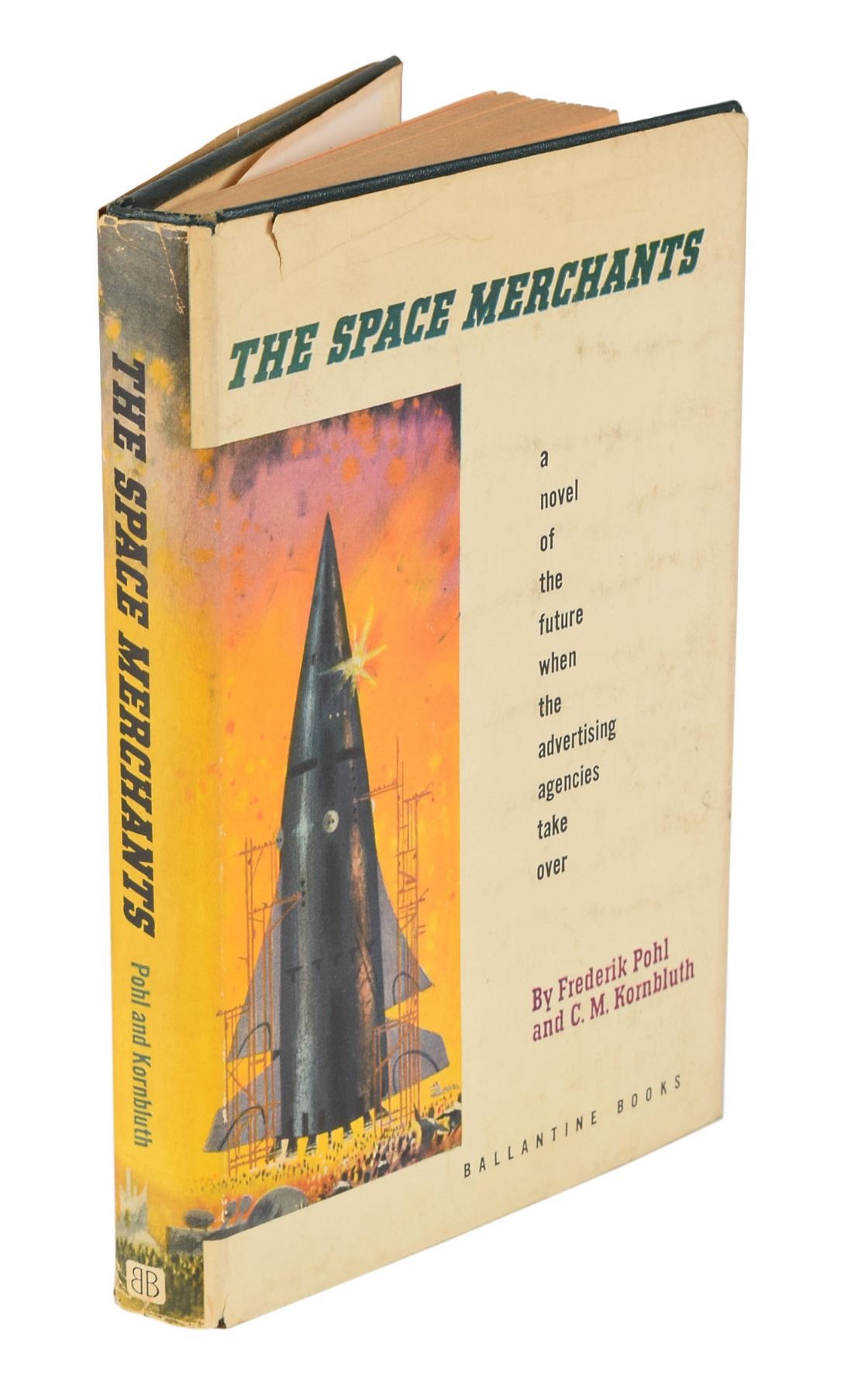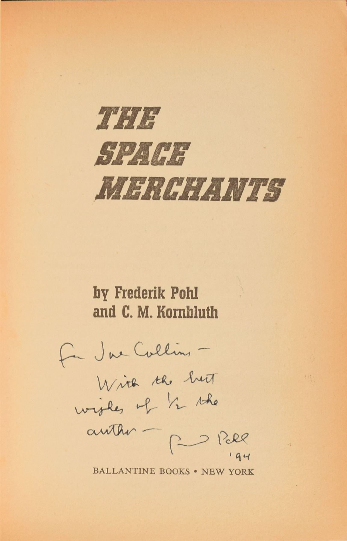 Signed book: The Space Merchants by Frederik Pohl and C. M. Kornbluth. First edition. NY: Ballantine Books, 1953. Hardcover with dust jacket, 5 x 7.25, 179 pages. Signed and inscribed on the first free end page in black felt tip, "For Joe Collins—with the best wishes of 1/2 the author—Frederik Pohl, '94." Autographic condition: fine, with toning to edges of the signed page. Book condition: VG/VG-, with toning to textblock edges, creasing and small tears to dust jacket edges, and a bit of soiling to dust jacket.