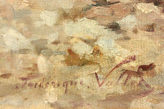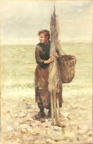 Oil on canvas. Unframed. Signed lower left. Frederique Vallet-Bisson, French (born 1865). Approx. 21 1/2" H x 13 5/8" W. Wax relined.