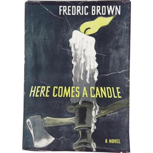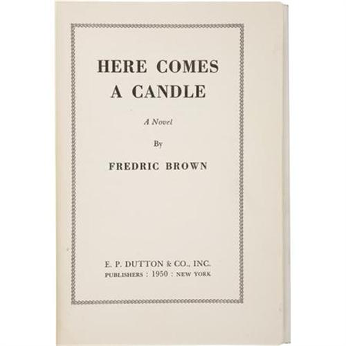 <B>Fredric Brown. </B></I><B><I>Here Comes a Candle</B></I></B></I>. New York: E. P. Dutton & Inc., 1950. <BR>First edition. Octavo. 256 pages.<BR><BR>Publisher's black cloth with silver titles. Original price-clipped pictorial dust jacket. Mild tape stains on the boards, light wear at the spine ends, and mildly bumped corners. Front free endpaper shows a previous dealer's stamp, and the rear endpapers have minor tape staining. Textblock clean and bright. Dust jacket has some rubbing, noticeable creases on both panels, and a 1.5 inch tear at the bottom of the front flap fold. Verso shows mild damp-staining at the top edge and spine. Overall, a very good copy. <I>From the Robert and Diane Yaspan Collection.</B></I><BR><BR><b>Shipping:</b> Books & Catalogs (<a target="_blank" href="http://www.heritageauctions.com/common/shipping.php">view shipping information</a>)