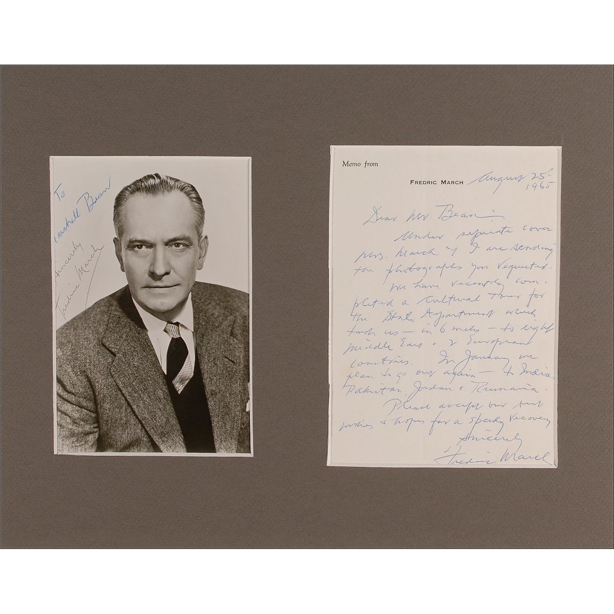 ALS, one page, 5 x 7, personal letterhead, August 25, 1965. Letter to an admirer. In part: “Under separate cover Mrs. March and I are sending the photographs you requested. We have recently completed a cultural tour for the State Department which took us—in 6 weeks— to eight Middle East & 2 European countries.” Matted with a glossy 5 x 7 photo of March, inscribed by March, “To Marshall Bean,” above his pre-printed signature, to an overall size of 14 x 11. Vertical fold to letter and scattered surface marks and creases to photo, otherwise fine condition.