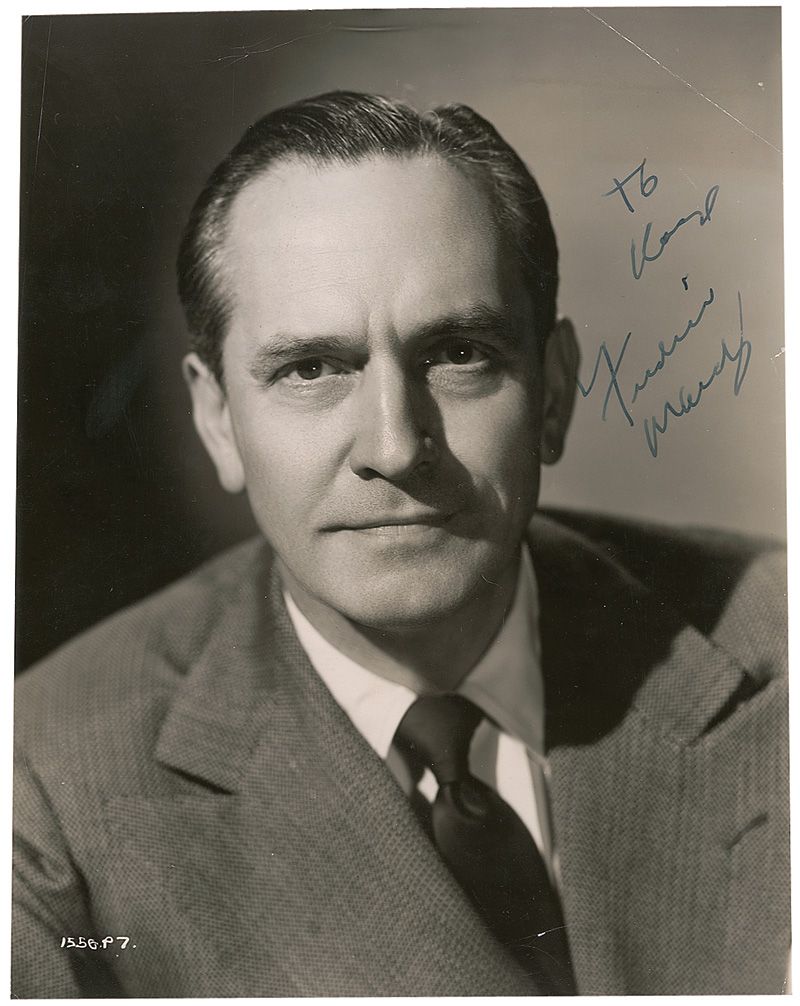 Handsome vintage glossy 7.5 x 9.5 photo, signed and inscribed in black ink “To Karl, Fredric March.” In very good condition, with scattered surface marks and creases, a heavier crease in the upper right corner, and some light discoloration from tape on the reverse.