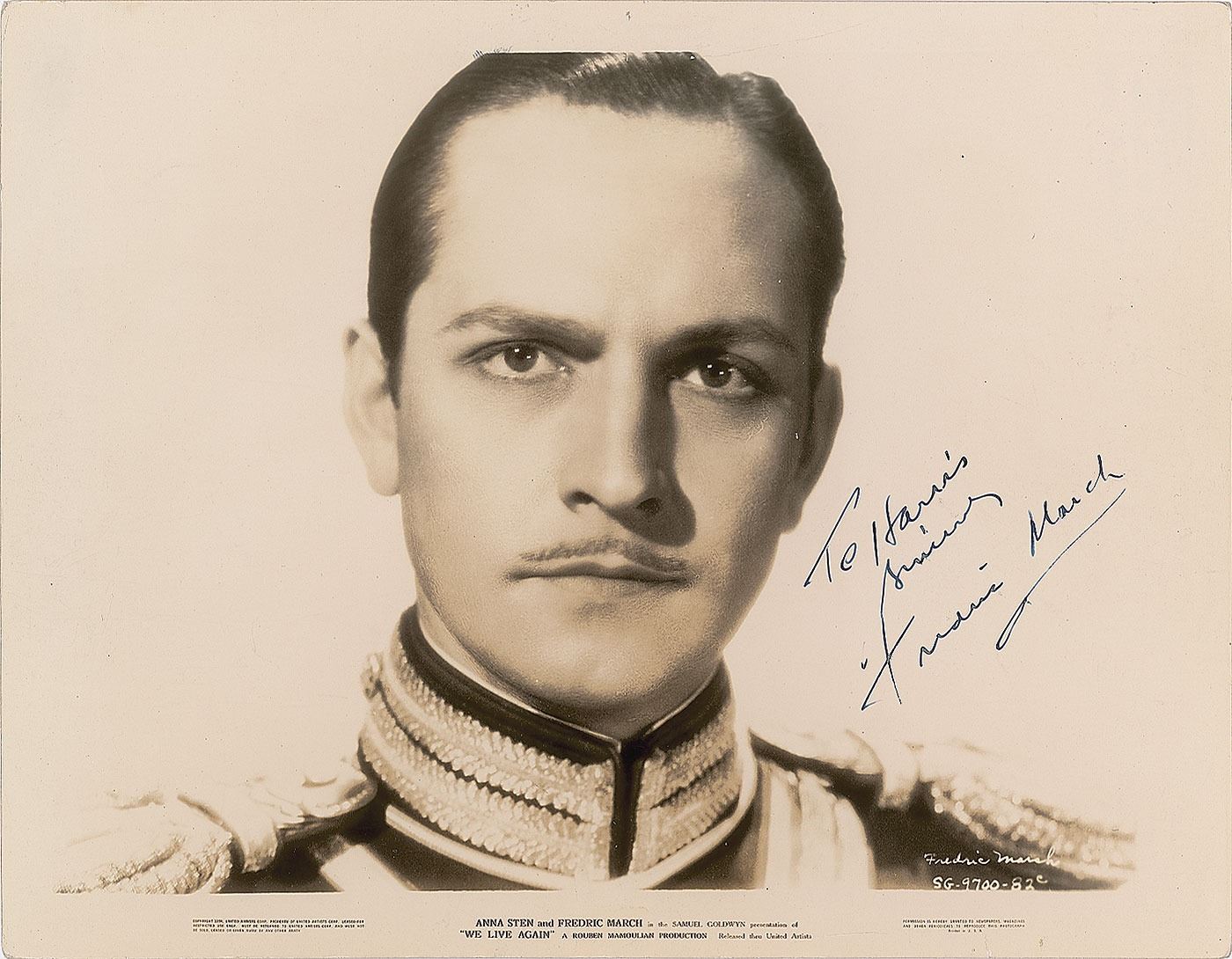 Glossy 10 x 8 United Artists publicity photo of Fredric March as Prince Dmitri Nekhlyudov from the 1934 film We Live Again, signed and inscribed in black ink, "To Harris, Sincerely, Fredric March.” In fine condition, with a pin hole to top edge, a small tear to bottom edge, and trivial edge creases, all of which could be easily matted out. From the Harvey and Rhoda Kuflik Collection.
