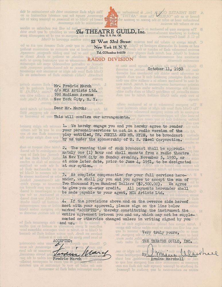 DS, one page, 8.5 x 11, October 11, 1950. Contract between the Theatre Guild, Inc., and March in which the latter agrees to render "personal services to act in a radio version of the play entitled Dr. Jekyll and Mr. Hyde, to be broadcast by us under the sponsorship of U. S. Steel Corporation." Signed at the conclusion in black ink by March. In fine condition.