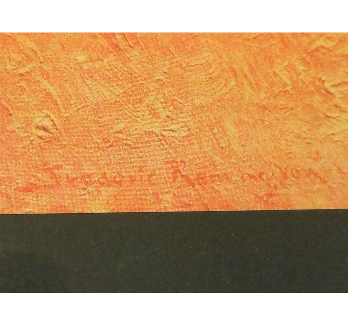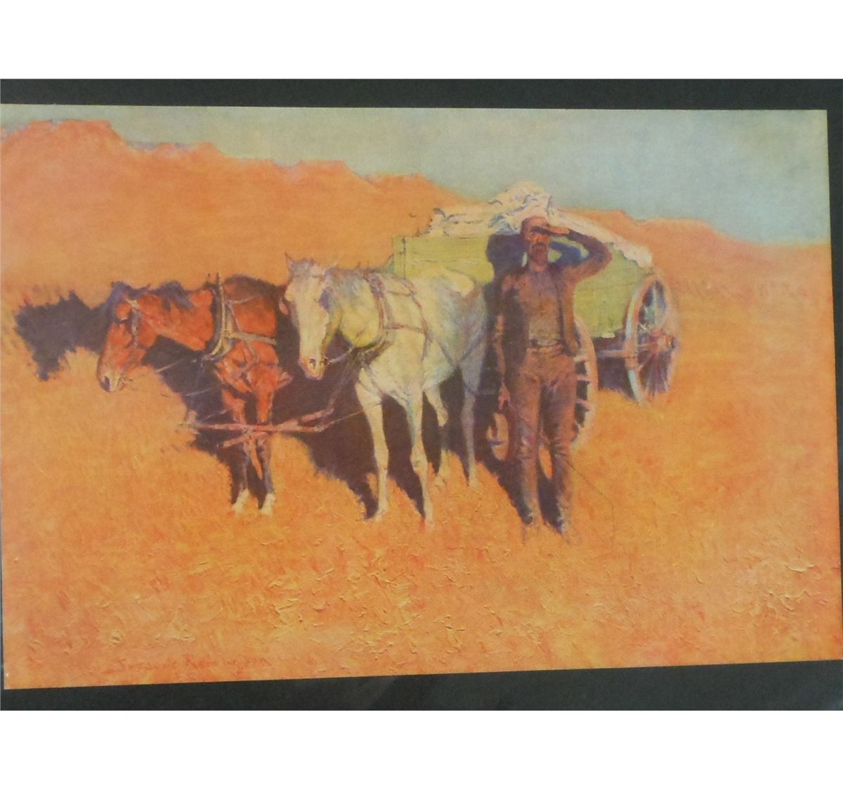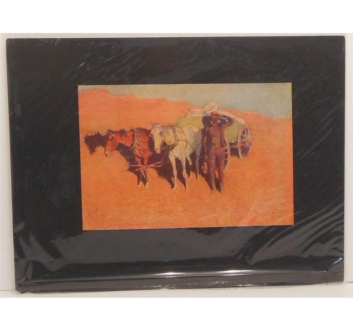 8 3/8" x 12 5/8" chromolithograph mounted and sealed in plastic. Fredric Remington (1861- 1909) Painter, specialized in western scenes. Illustrator, sculptor and etcher. Circa early 1900's. "Benighted for a Dry Camp" in excellent condition.