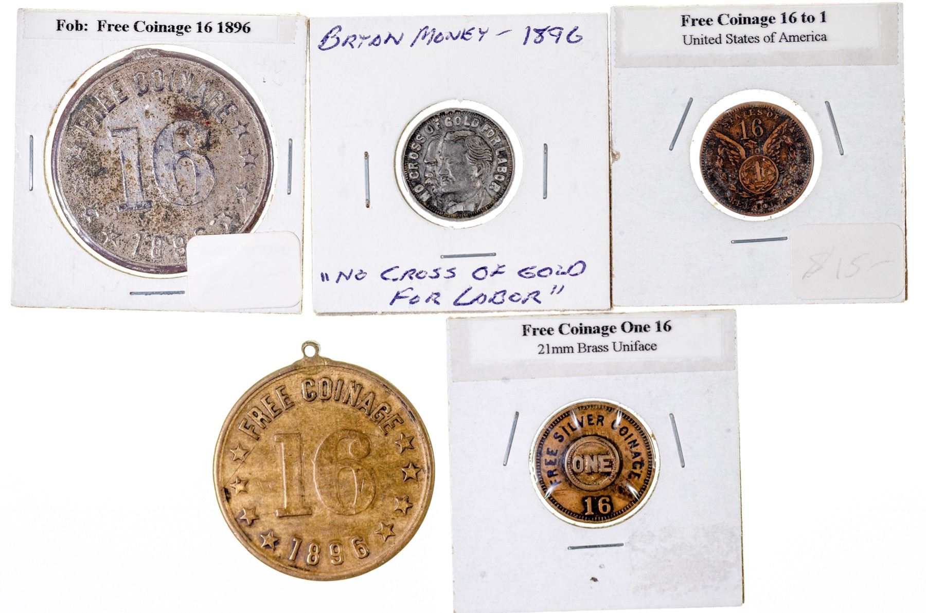 Two Free Coinage Fobs and 3 Free Coinage mini medalettes: 1) Brass campaign fob with the inscription // FREE COINAGE / 16 / 1896 //. The reverse is blank except for the inscription PAT APPLD FOR. Brass, 37.5mm, AU; 2) The same piece silver-plated with the loop removed. AU; 3) Stickpin (missing the pin). Obv: // UNITED STATES OF AMERICA / FREE COINAGE // surrounding an American Eagle in a wreath with 16 above its head, TO on its neck, and a circular shield bearing the number 1 in a wreath on its chest. The reverse carries the notice, // J. A. CRUMPTON / LINCOLN, NEB. / PAT. APPD FOR //. Brass, 17mm; 4) Uniface, // FREE SILVER COINAGE / ONE / 16 //. Brass, 21mm; 5) Busts of Bryan and Sewall, // NO CROSS OF GOLD FOR LABOR //. Uniface, White Metal, 19mm. City: State: Date: