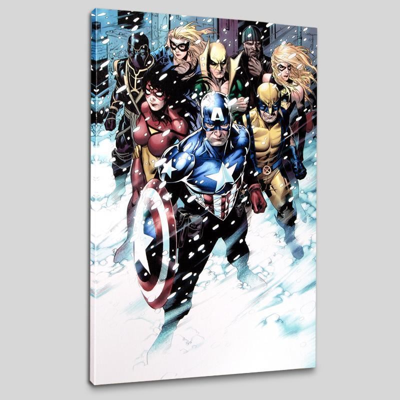 A piece of comic book history, this limited edition, from original art by Jim Cheung, depicts classic Marvel characters. Jim Cheung was named as one of 2005's "Young Guns" by Marvel Editor-in-Chief Joe Quesada, and has been described as a "future superstar penciller." "Free Comic Book Day 2009 Avengers #1" is a limited edition numbered giclee on canvas by Jim Cheung presented by Marvel Comics. This piece comes gallery wrapped. Includes Certificate of Authenticity! Measure approx. 18" x 27" (image).