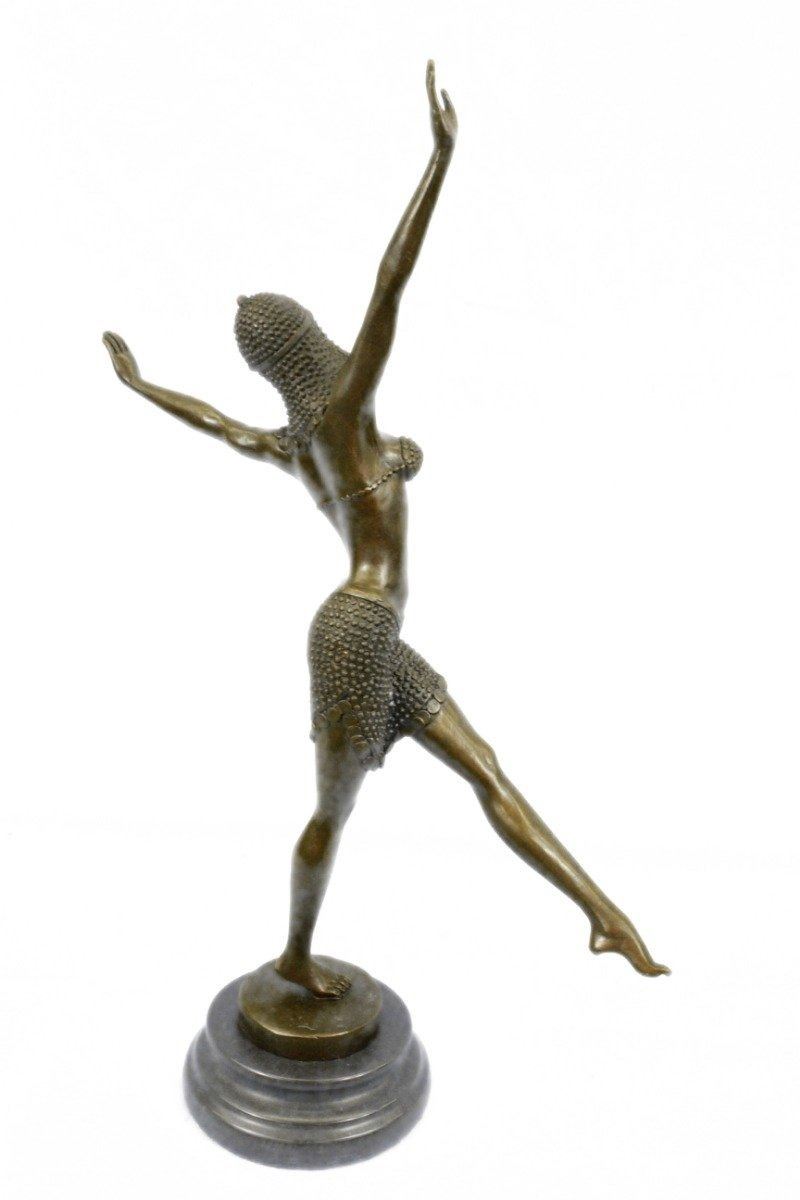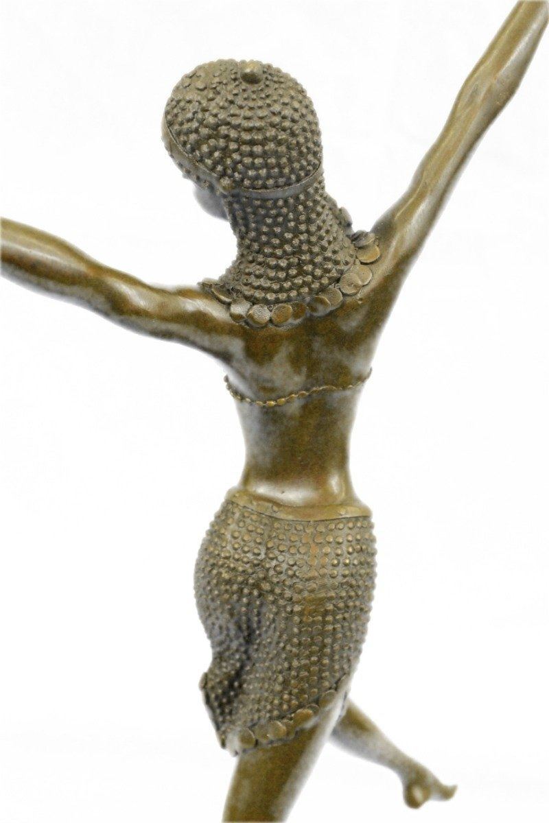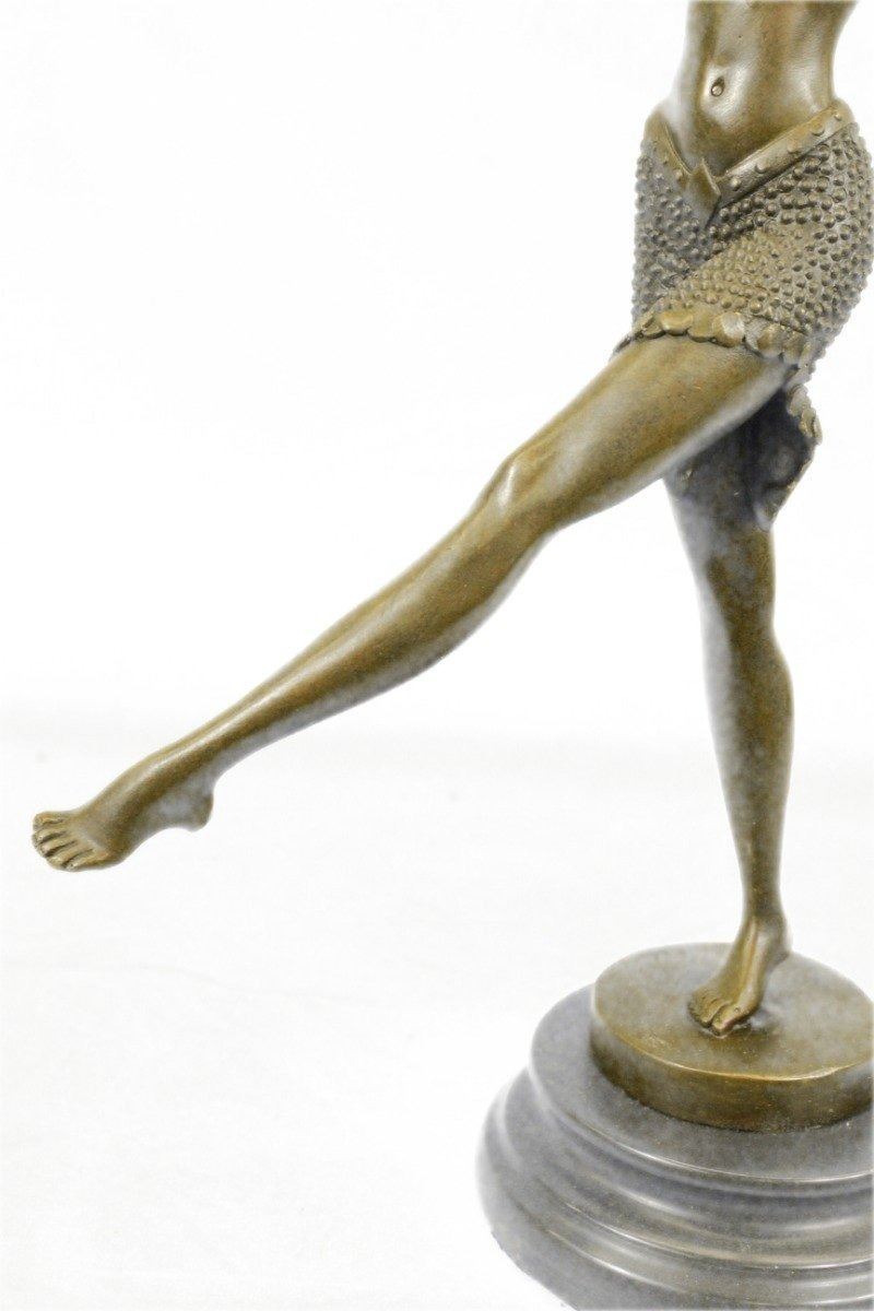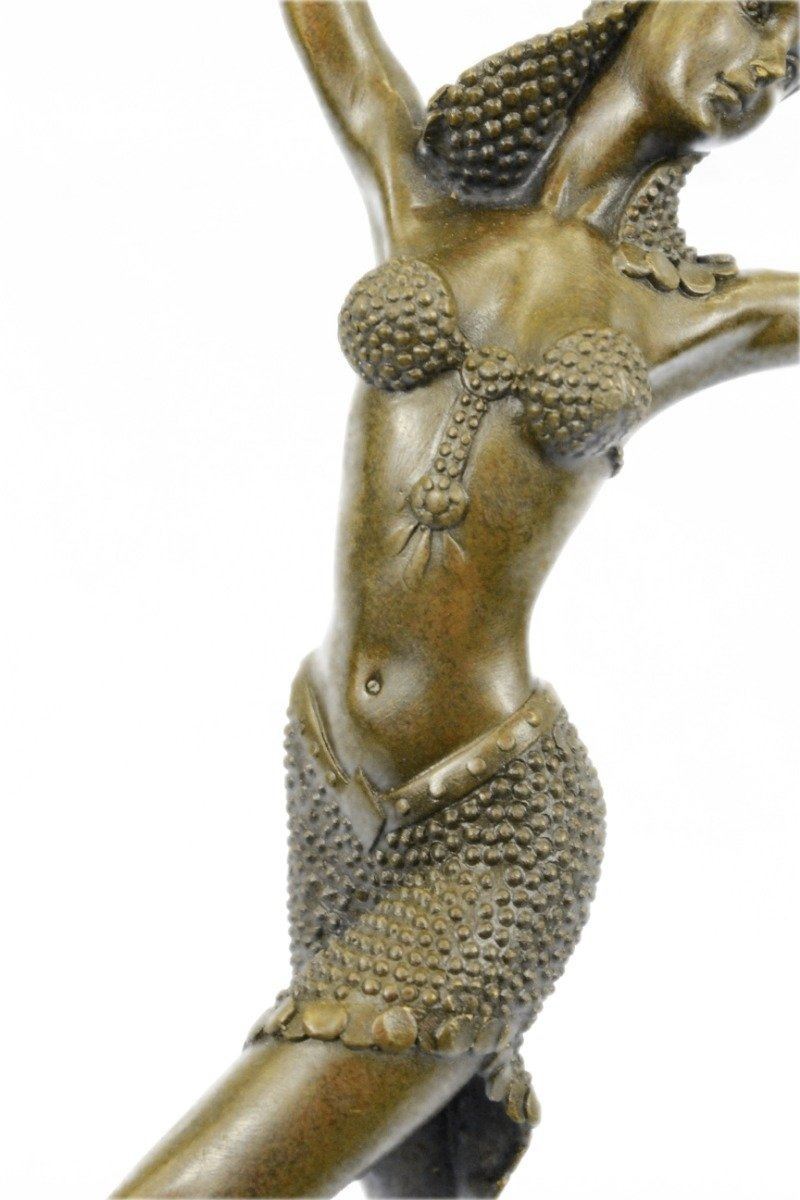 With grace, agility and flexibility, this vibrant dancer is light onher toes. She jovially kicks a long lean leg high up as she prances.Her beaded mini skirt jiggles behind her as she shakes her hips to themusic. Bodies sway and men whistle as they watch her perform. Shewears a matching beaded bra top and headdress. This nimble dancer isin a brown patina and mounted on a marble base. 100% bronze andhandmade, she was cast using the Lost Wax Method. Bronze Dimensions with Marble Base: Height 17 X Width 14 inches. Weight: 8 LBS. Inventory: 82DS1254028
