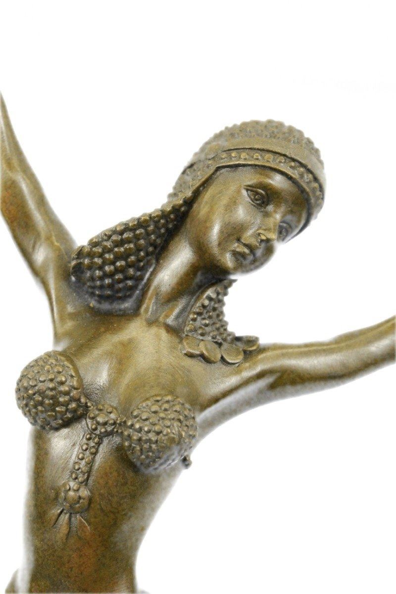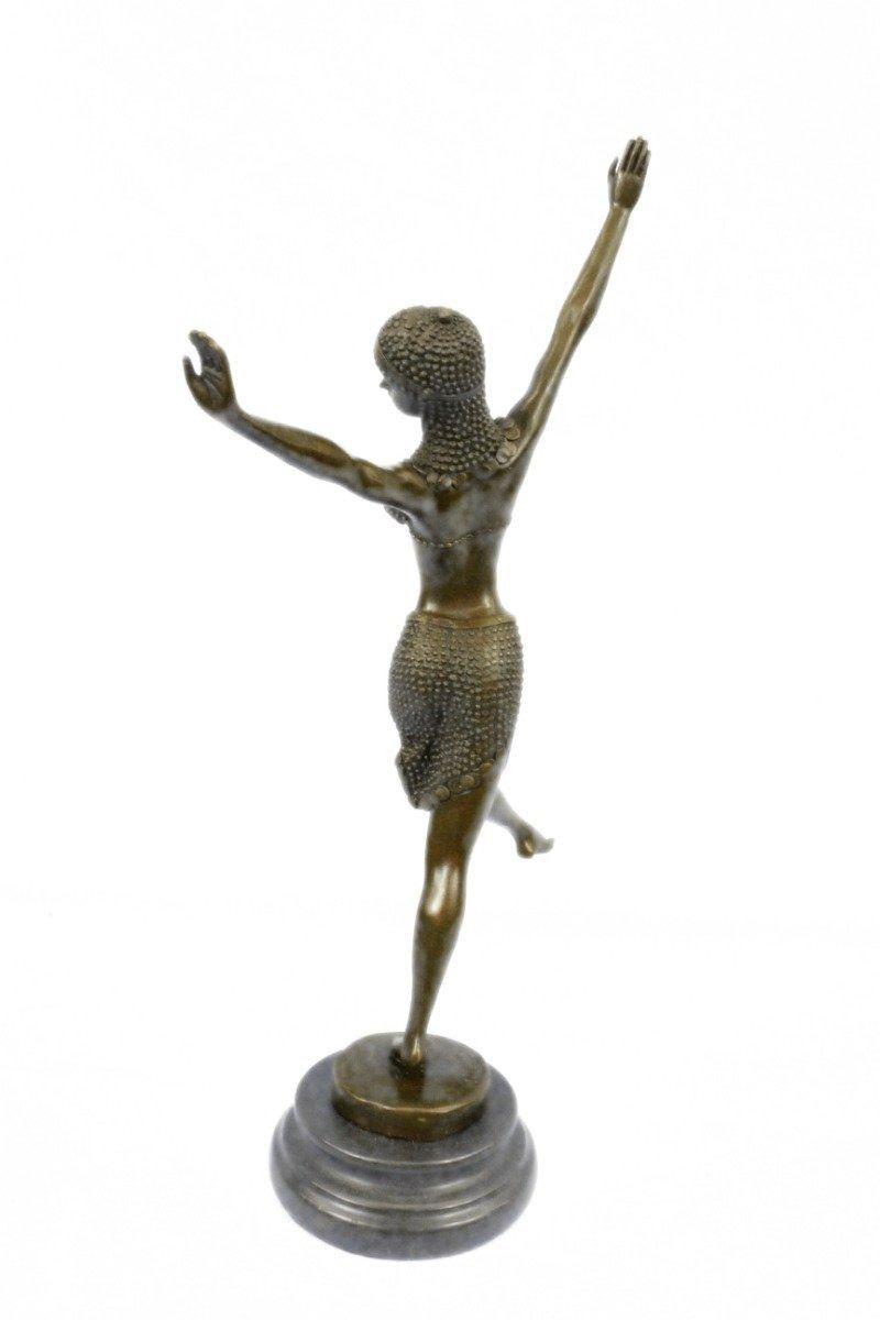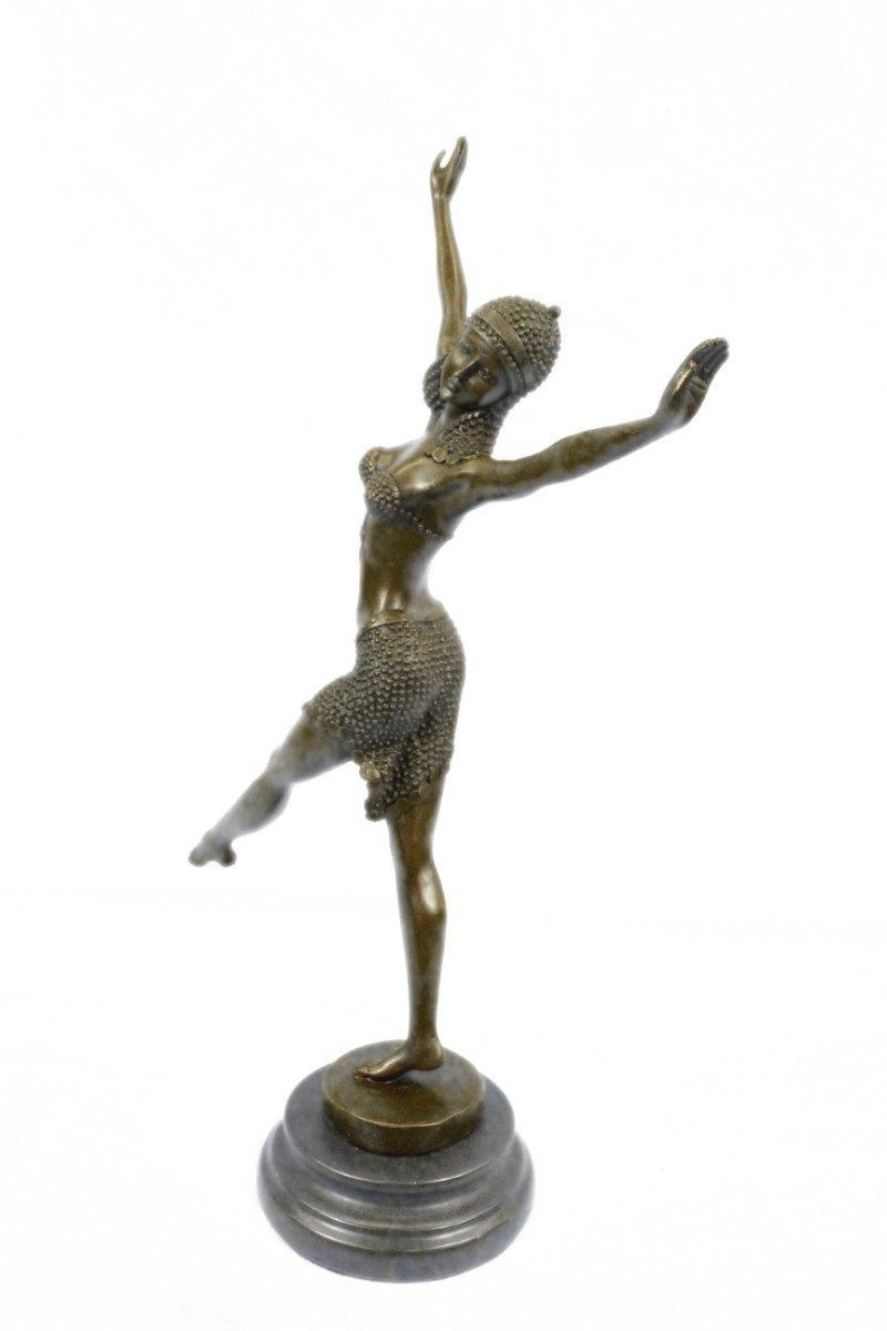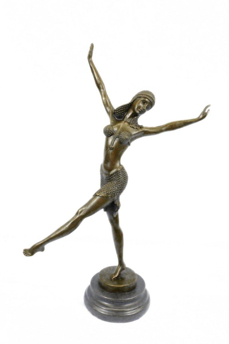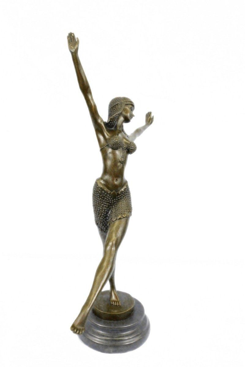 With grace, agility and flexibility, this vibrant dancer is light onher toes. She jovially kicks a long lean leg high up as she prances.Her beaded mini skirt jiggles behind her as she shakes her hips to themusic. Bodies sway and men whistle as they watch her perform. Shewears a matching beaded bra top and headdress. This nimble dancer isin a brown patina and mounted on a marble base. 100% bronze andhandmade, she was cast using the Lost Wax Method. Bronze Dimensions with Marble Base: Height 17 X Width 14 inches. Weight: 8 LBS. Inventory: 82DS1254028