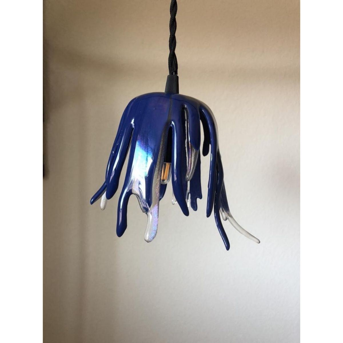 Artisan handmade free form "tentacle" blue fused glass plug-in pendant light. The shade created in a kiln with strips of cobalt blue & iridized clear glasses. Commercial cord is a black cloth wrapped & twisted measuring 14 feet, with an in-line switch. Candelabra socket wired to cord & attached to shade. Uses a candelabra or E12 bulb which is included. Shade measures approximately 6" L X 4 1/2" D.Â