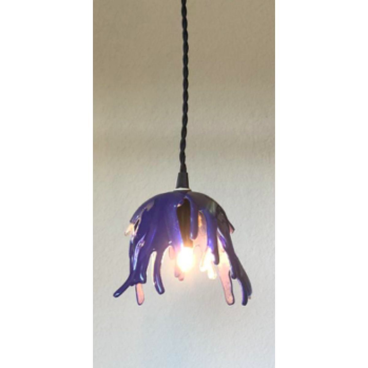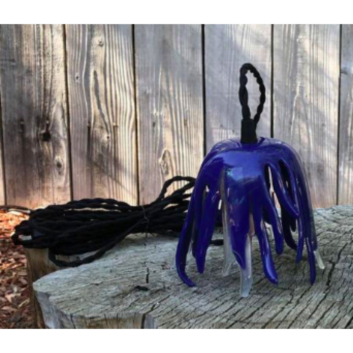 Artisan handmade free form "tentacle" blue fused glass plug-in pendant light. The shade created in a kiln with strips of cobalt blue & iridized clear glasses. Commercial cord is a black cloth wrapped & twisted measuring 14 feet, with an in-line switch. Candelabra socket wired to cord & attached to shade. Uses a candelabra or E12 bulb which is included. Shade measures approximately 6" L X 4 1/2" D.Â