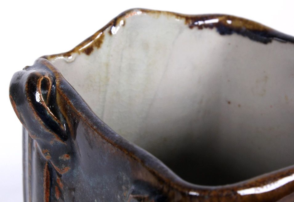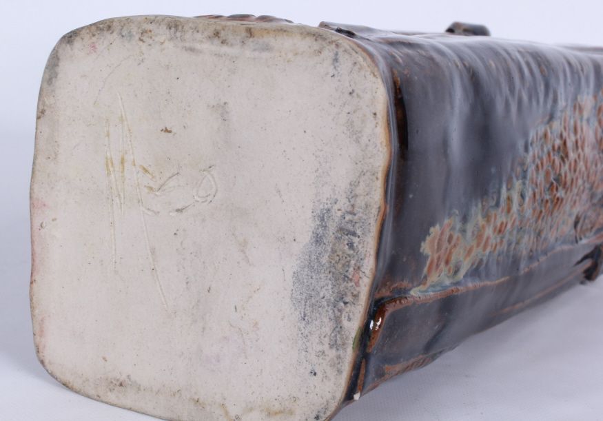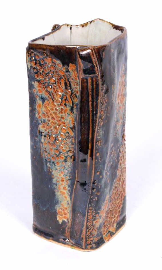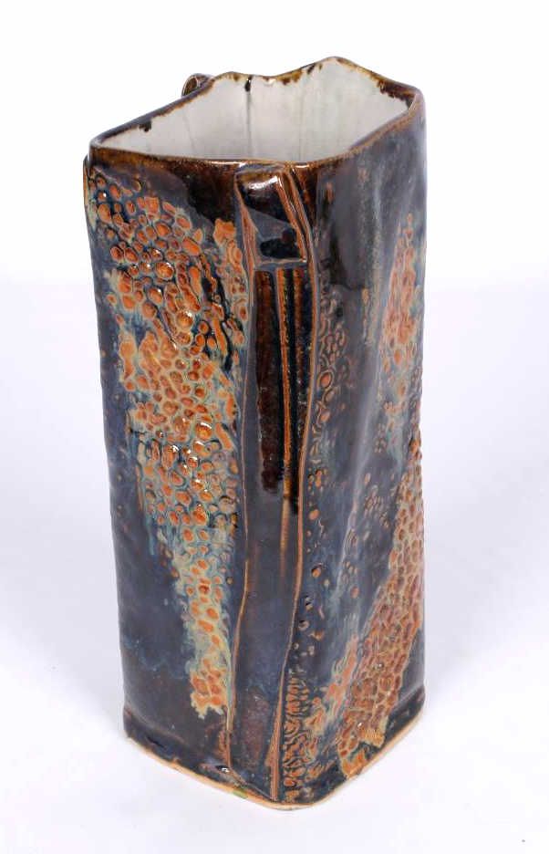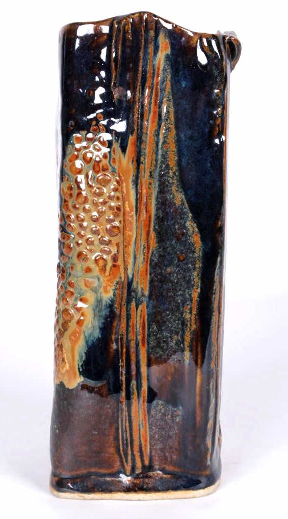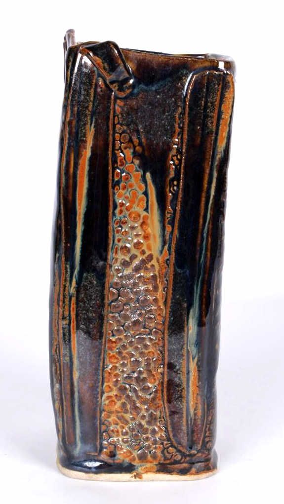 This piece is a hand made work of art pottery showing an abstract form and made with great craftsmanship. The piece is hand signed on the bottom. This is a unique form that features a textured design with a rust and copper colored glaze over a dark brown foundation. In excellent condition. The piece measures 9.5" tall, 3 5/8" deep and 3.5" wide.
