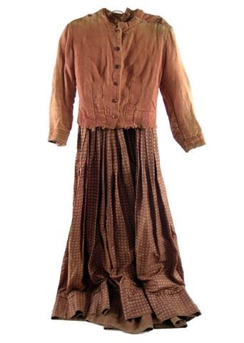Based on a true story is Free State of Jones (2016) starring Matthew McConaughey and Keri Russell and this is Serena's (Keri Russell) screen used brown burlap button up the front long sleeve jacket, There is a Western Costume Company label on the inside of the jacket. Includes a brown with white flower print long sleeve 'Helen Larson' floor length dress. This costume Includes a production wardrobe tag.