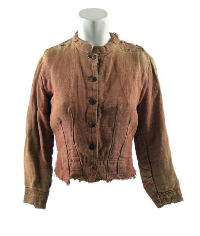 Based on a true story is Free State of Jones (2016) starring Matthew McConaughey and Keri Russell and this is Serena's (Keri Russell) screen used brown burlap button up the front long sleeve jacket, There is a Western Costume Company label on the inside of the jacket. Includes a brown with white flower print long sleeve 'Helen Larson' floor length dress. This costume Includes a production wardrobe tag.
