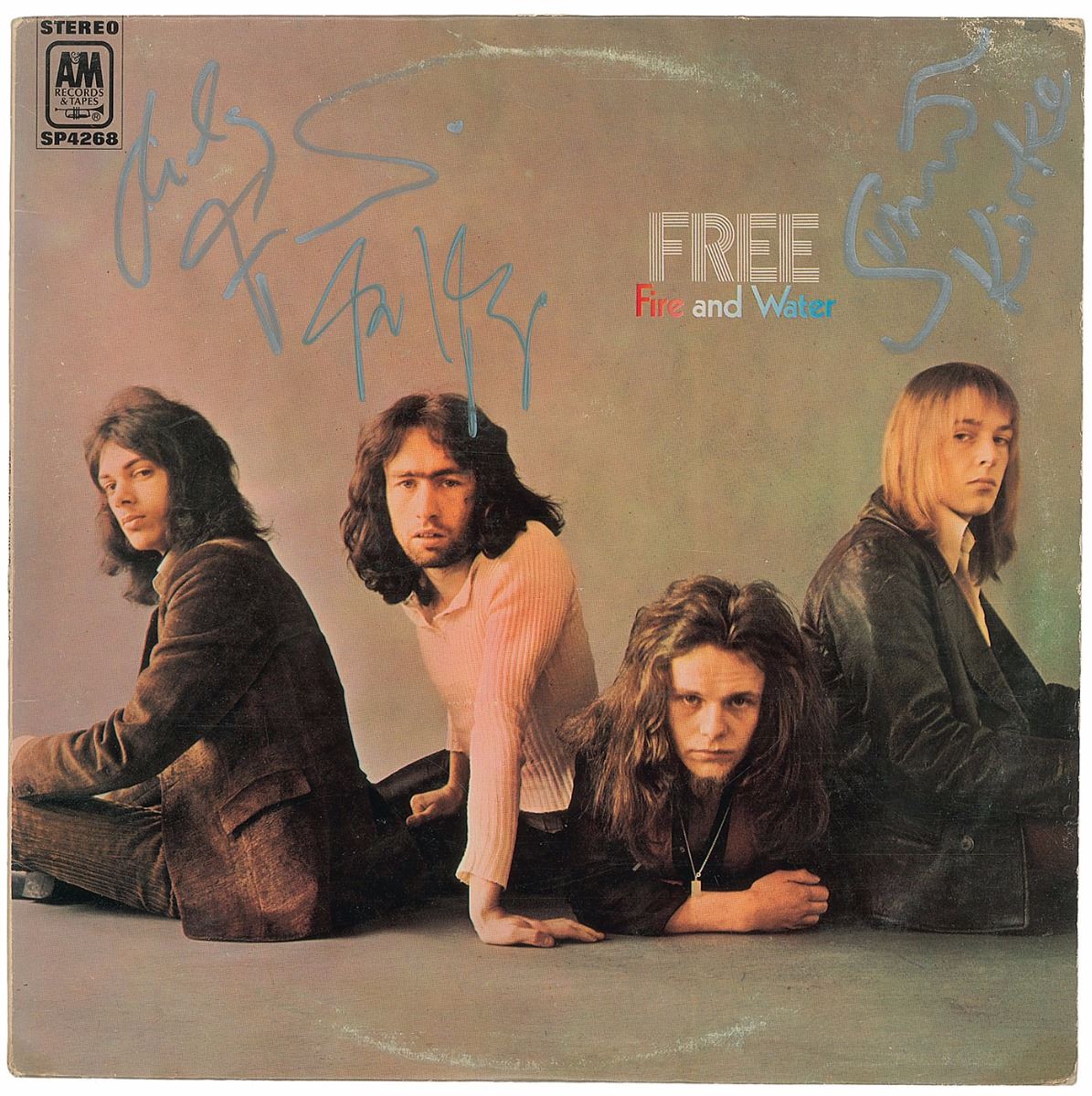 Fire and Water album signed on the front cover in silver ink by Paul Rodgers, Andy Fraser, and Simon Kirke. Some surface rubbing and a light ‘ring of wear,’ and slight creasing and wear to edges, otherwise fine condition. The record is included.