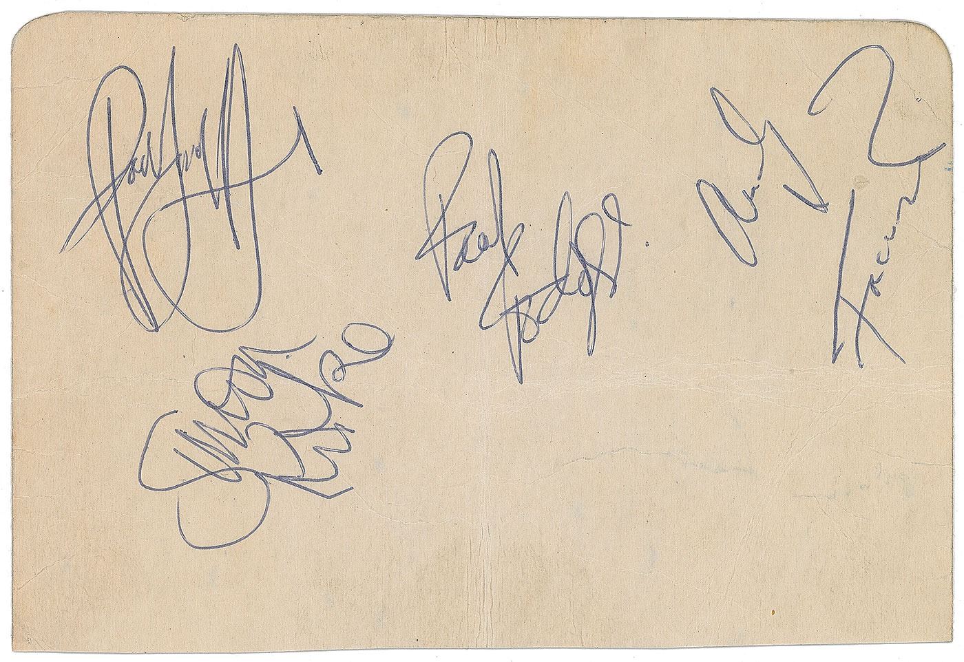 Ballpoint signatures of Paul Rodgers, Paul Kossoff, Andy Fraser, and Simon Kirke on an off-white 6.25 x 4.25 trimmed cardstock sheet. In very good condition, with creasing and intersecting folds.