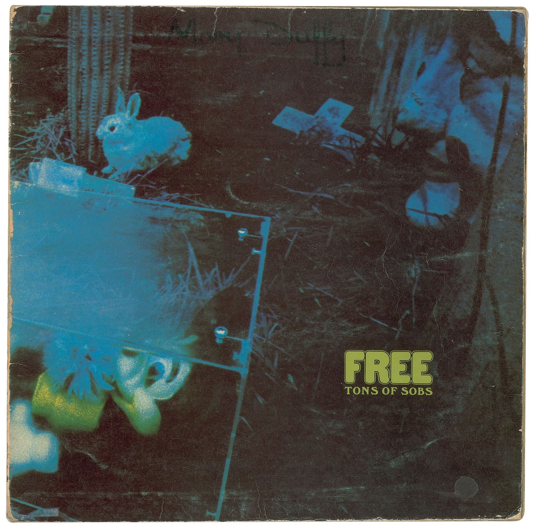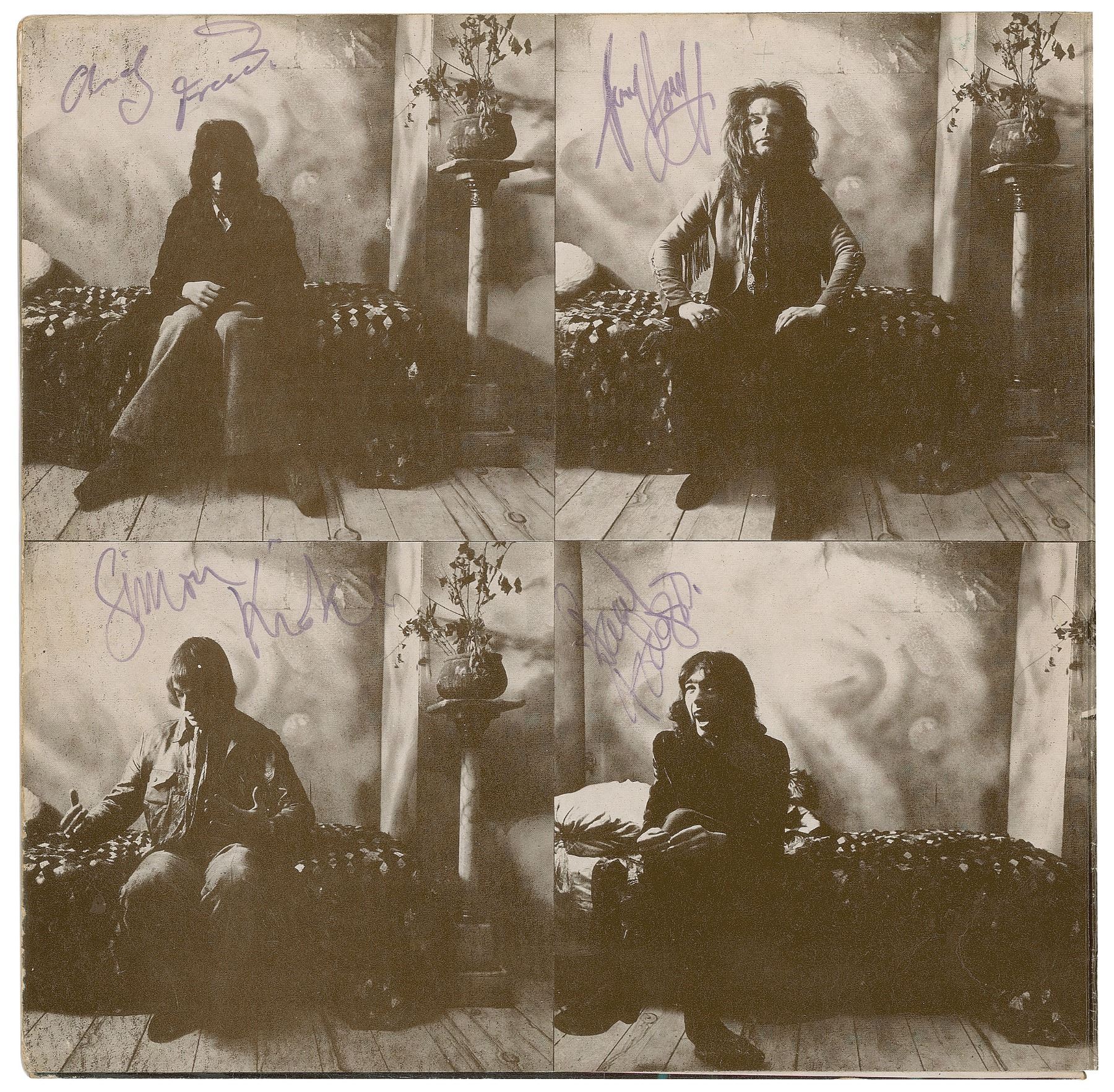 UK pressing of Tons of Sobs, the debut album by Free, signed on the inner gatefold next to their respective images in black felt tip by Paul Rodgers, Paul Kossoff, Andy Fraser, and Simon Kirke. In very good condition, with light creasing, wear and partial separation to the spine, and an ownership notation on the inner facing panel. The record is not included. Consignor notes that the signatures were obtained at the Locarno (also known as the Mecca) in Sunderland, England on September 12, 1969. Accompanied by a certificate of authenticity from Tracks and by a letter of provenance from the original recipient: “Free were playing at the Mecca ballroom in Sunderland (locally known as the Fillmore of the North East) this was 1969 I was there that night and had bought the album ‘Tons Of Sobs’ for my then girlfriend and took it with me to the gig with the intention of getting it signed, having met and got to know the band from earlier gigs. We spent some time together after the show also in the company was Marc Bolan and whispering Bob Harris (from Old Grey Whistle Test). It was a good night! This was a time when things were less complicated.”