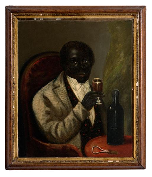 Several variables contribute to the attribution to Molineaux. First, the portrait reflects many stylistic tendencies common with British portraiture of the period. Second, and most obvious, the African American sitter is missing his two front teeth, perhaps the result of his fighting career. Other images of Molineaux bear similar resemblances, but depict the boxer at fighting age. Finally, Molineaux is depicted here engaging in the past-time which lead to his demise - drinking. An 18th century engraving by John Young (1755-1925)(Sold at Sotheby's, Oct. 26, 1990), depicts a sturdy Molineaux in fighting position. A well known illustration by Rowlandson depicts the second match of Cribb and Molineaux, and a widely produced Staffordshire figure of Molineaux occasionally surfaces. In each depiction, Molineaux is shown with a very dark complexion. Other examples of British portraiture and sporting art are featured in this sale from the same collector.
