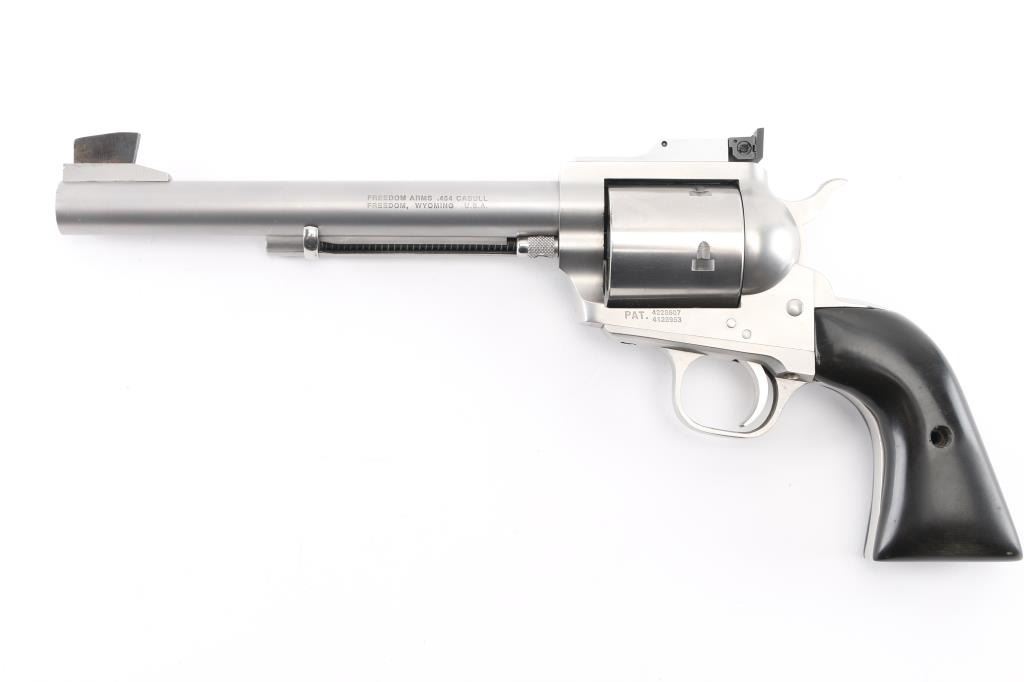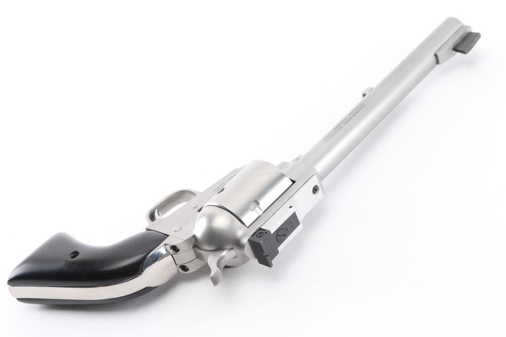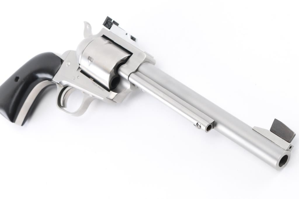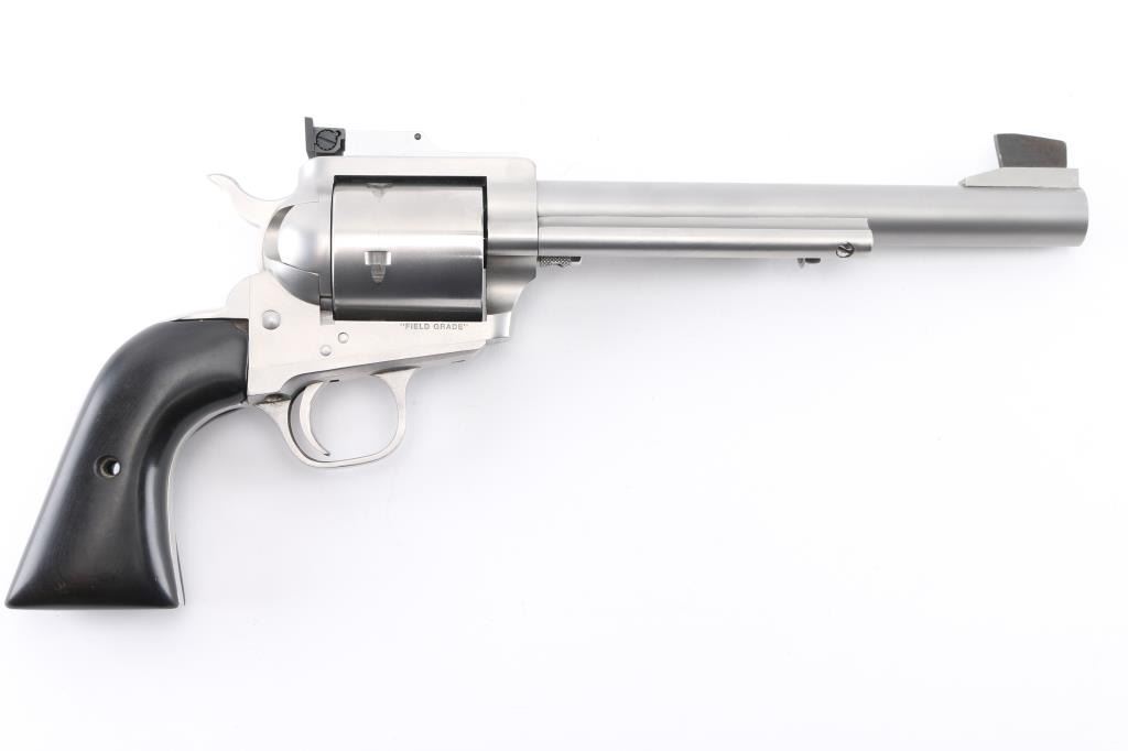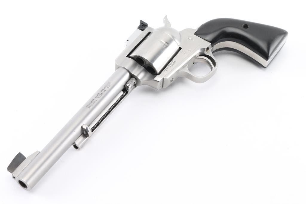 Single-Action revolver, 5-rd capacity. 7.5" barrel with SAA style ejector, serrated front ramp, and square-notch adjustable rear sights. Differs from the Premier grade only cosmetically, they are mechanically identical. Matte stainless steel finish, smooth cylinder, smooth wood grips. Bore and cylinders appear excellent/bright. Action is smooth/tight. Hammer locks up tight. Metal finish is excellent with a few very minor scratches, and slight drag line on the cylinder. Grips are very good, but there is a small chip out of the top right panel, and missing the screw. Comes in the original factory box with manual/paperwork. NRA Condition-Very Good/Missing the grip screw. Modern firearm,