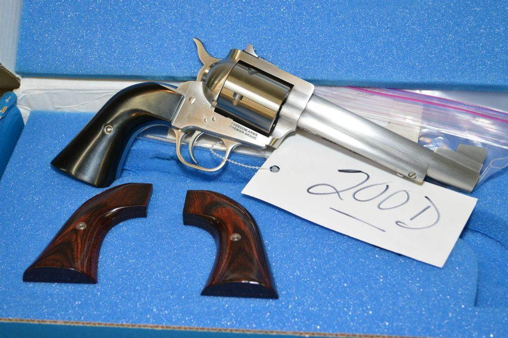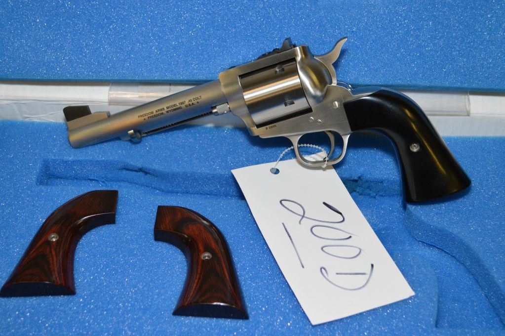Freedom Arms Model 1997 .45 Colt Cal 5 Shot Revolver w/ 140 mm bbl [ appears as new, unfired in orig box, booklet, etc. , Custom order from manufactuer, stainless finish, Macarta grips, plus additional set of wood grips ] Ser # P1386 Restricted Handgun Cert # 18296591